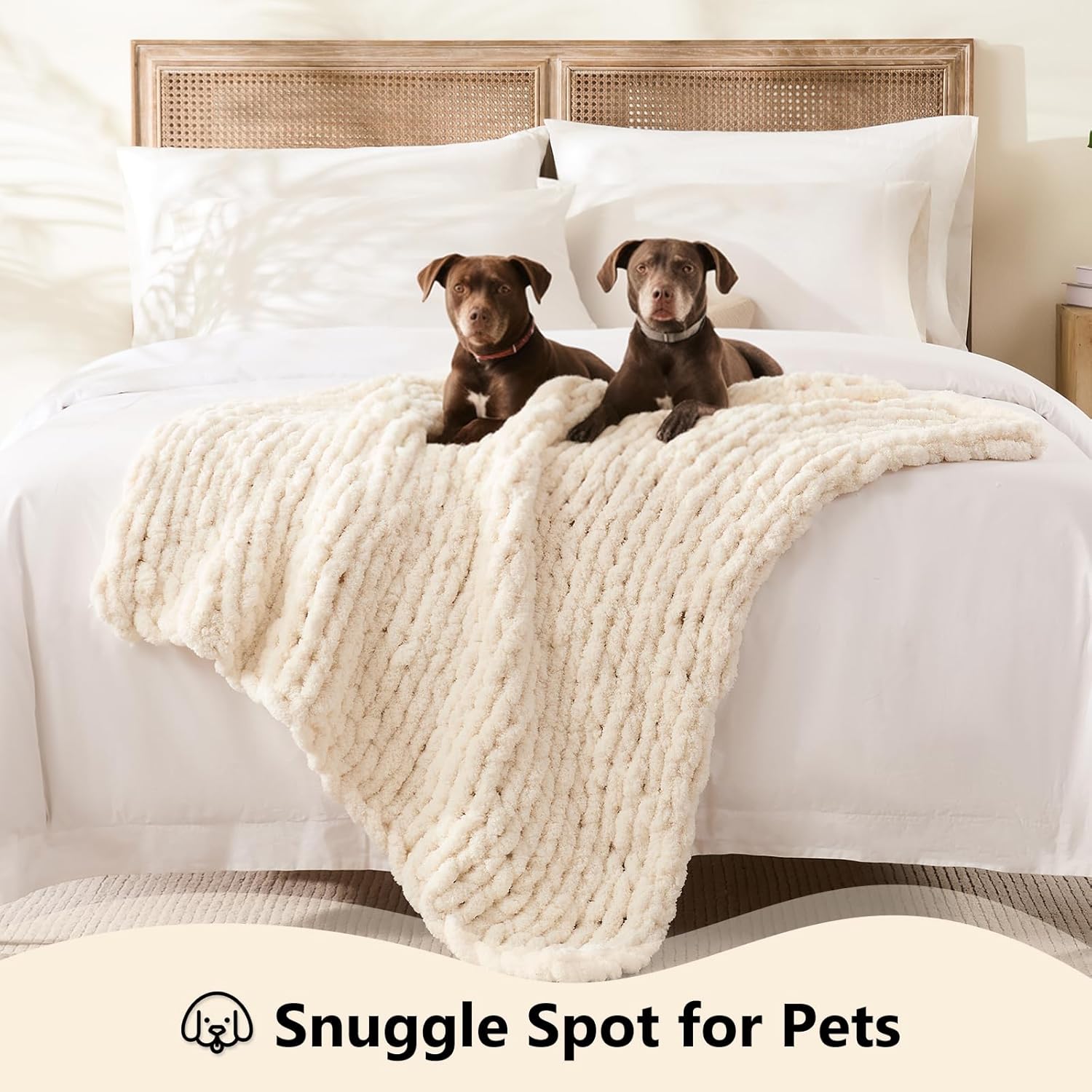 L'AGRATY Chunky Knit Blanket Throw: 30''x40'' Chenille Chunky Knitted Throw Blankets for Bed Couch - Handmade Thick Big Cable Knit Blankets - Large Crochet Rope Blanket for Home Decor(Ivory)