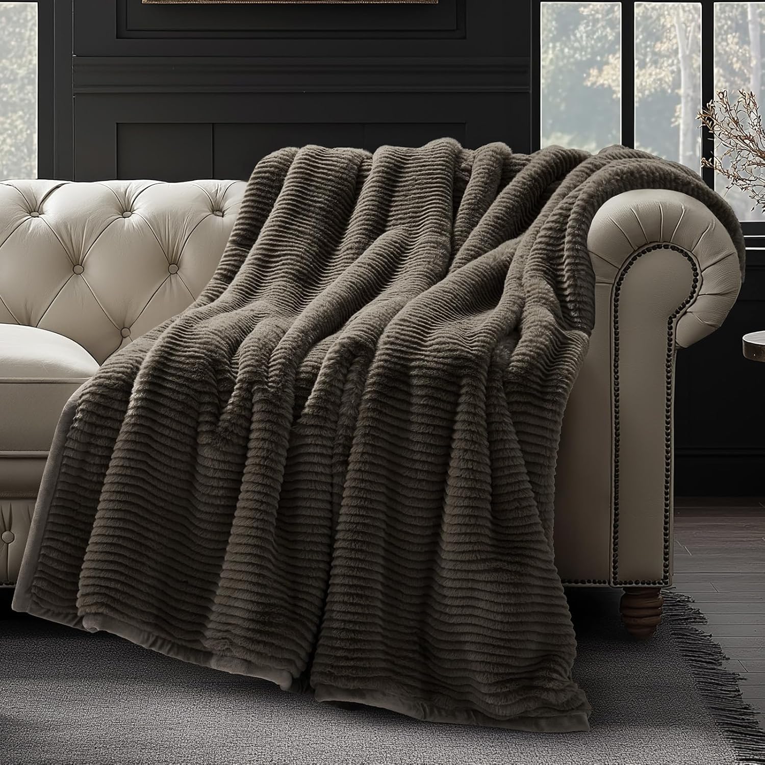 EVERGRACEHOME Ultra Soft Faux Fur Throw Blanket for Couch, Luxury Sculpted Texture Faux Rabbit Fur Blanket for Bed, Fluffy Thick Plush Warm Fuzzy Throw, 920GSM (Dark Taupe, 60''x80'')