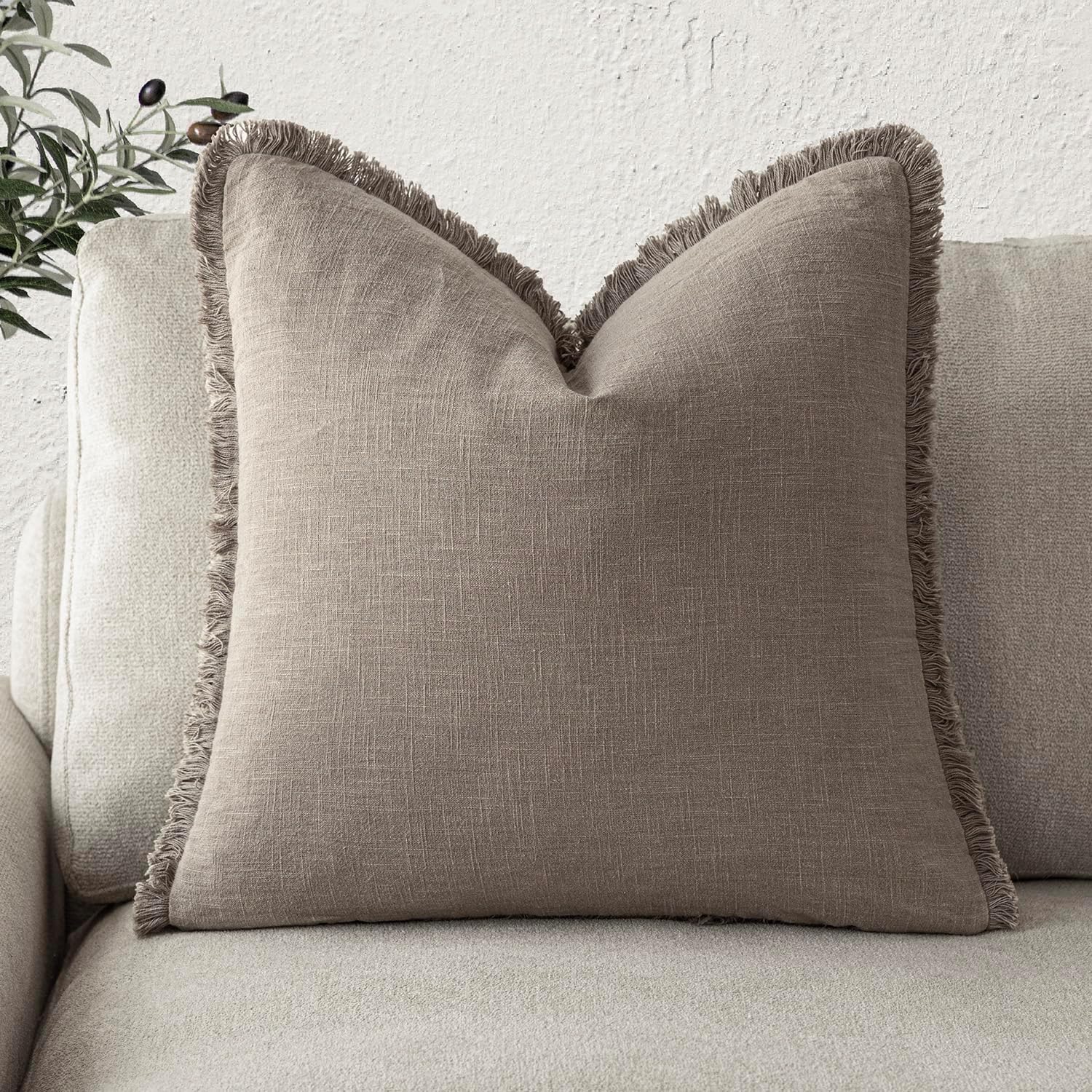 Foindtower Decorative Linen Fringe Throw Pillow Covers Cozy Boho Farmhouse Cushion Cover with Tassels Soft Accent Pillowcase for Chair Sofa Bed Living Room Home Decor, 22×22 Inch,1PC,Brown Tan