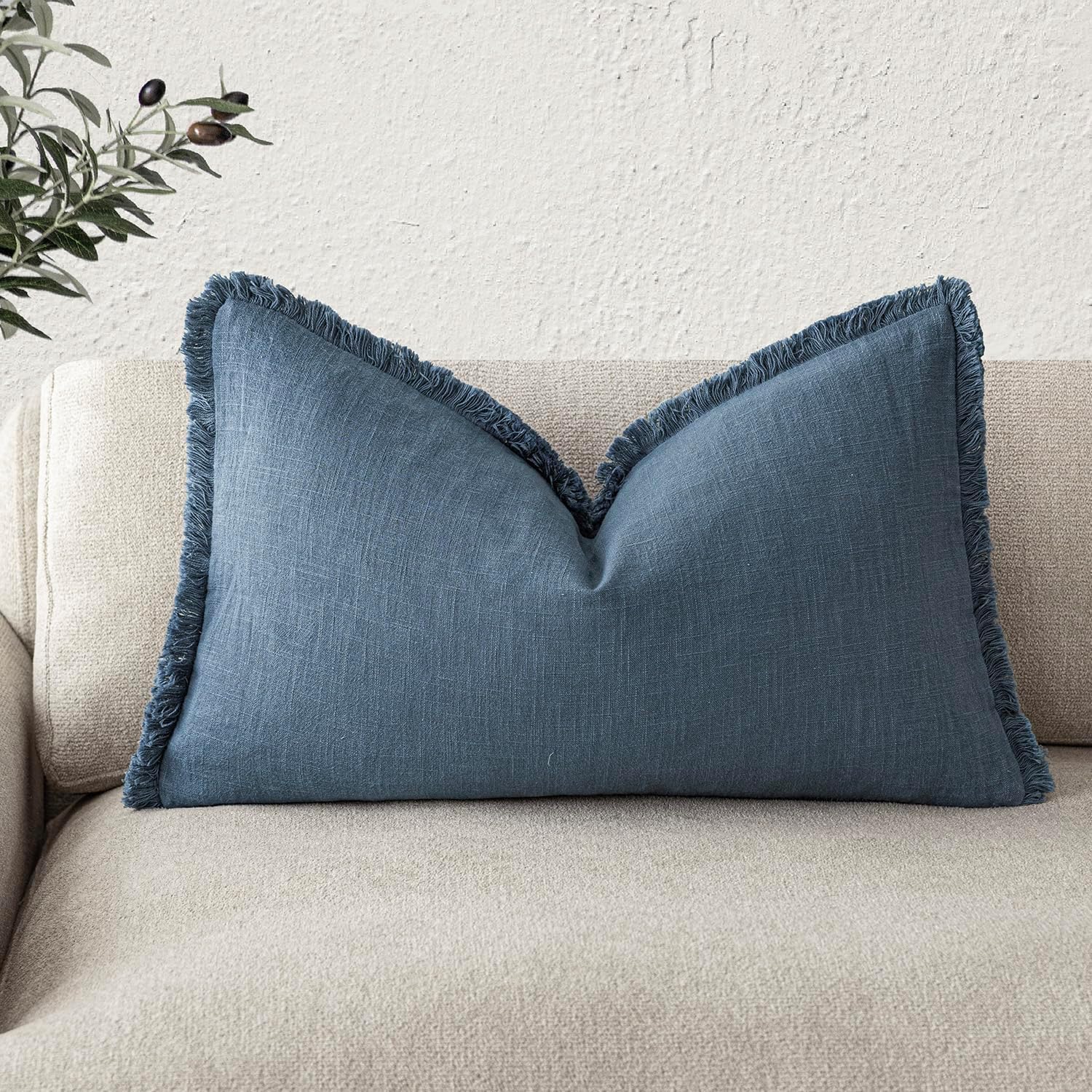 Foindtower Decorative Linen Fringe Lumbar Throw Pillow Covers Cozy Boho Farmhouse Cushion Cover with Tassel Accent Pillowcase for Sofa Bed Living Room Home Decor, 12×20 Inch,1PC,Dark Blue