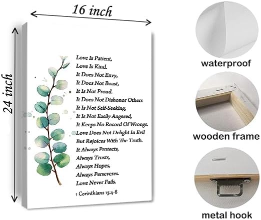 Love Is Patient Love Is Kind Wall Art 1 Corinthians 13 4-8 Canvas Print Positive Bible Verse Poster Scripture Painting Ready to Hang Home Office,Living Room,or Personal Space Framed 16 * 24 Inch