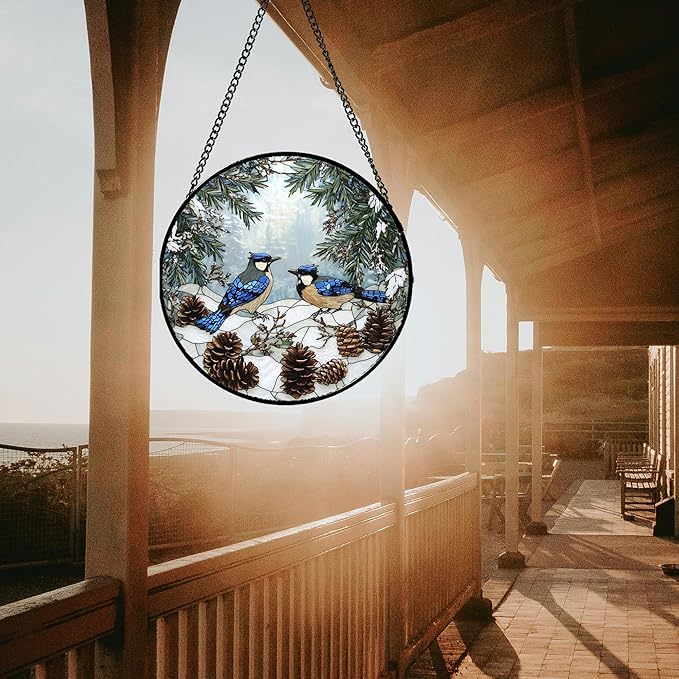 Stained Glass Window Hanging - Blue Bird Winter Forest Landscape Suncatcher for Door Garden Yard Sun Catchers Decor Christmas Mother's Day Birthday Gifts for Women Mom Nana Friend 15 in