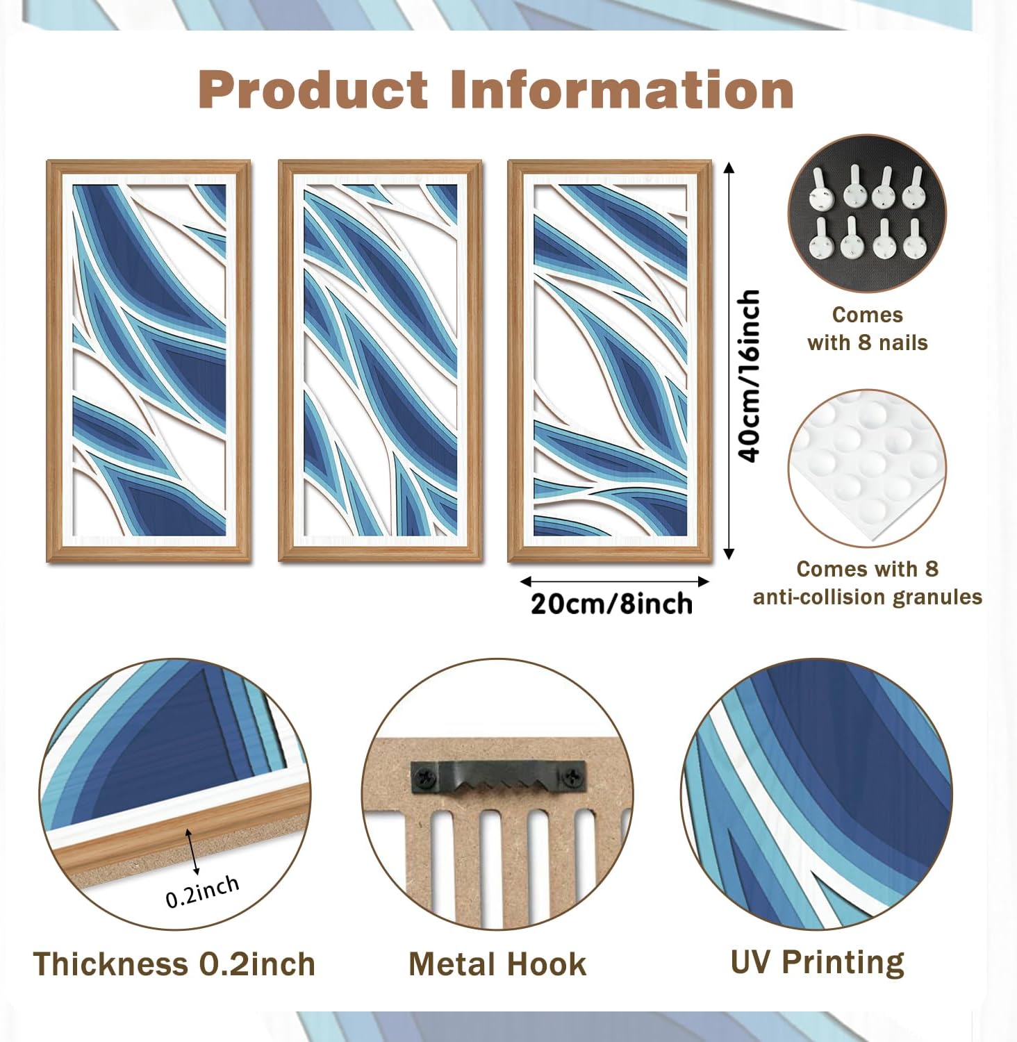 - Size for Easy Displaying:Mid century wall art each piece measures 20x40cm (7.9 x15.8 Inch). On the back of the Bohemian art painting, we have installed serrated hooks and the accompanying hardware includes 8 seamless nail and collision resistant particles.Blue geometric wall decor easy to operate, you just need to find a suitable position to hang or disassemble directly