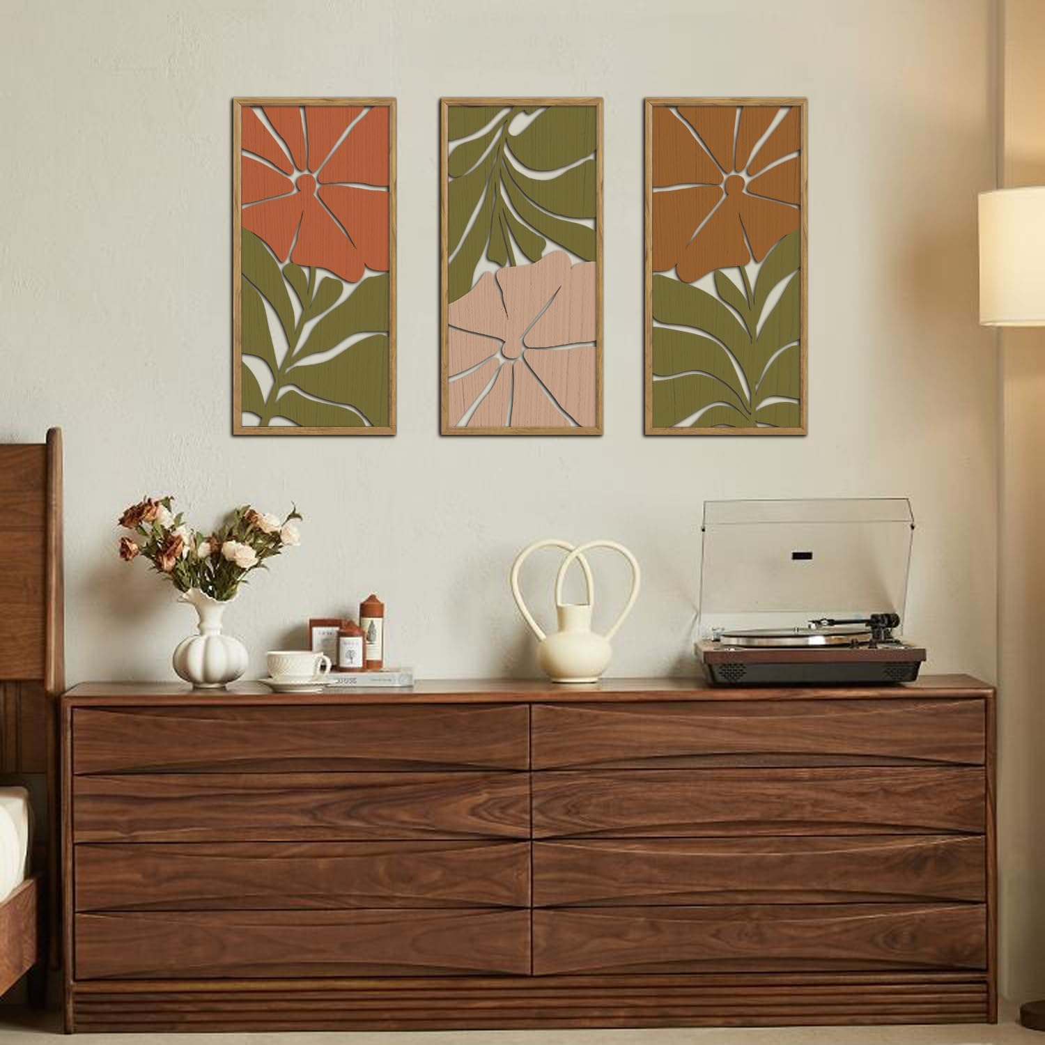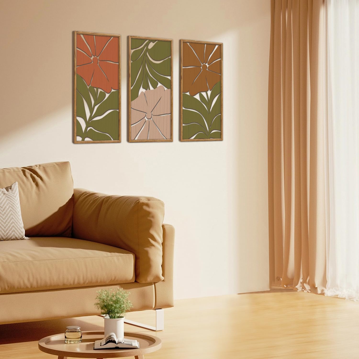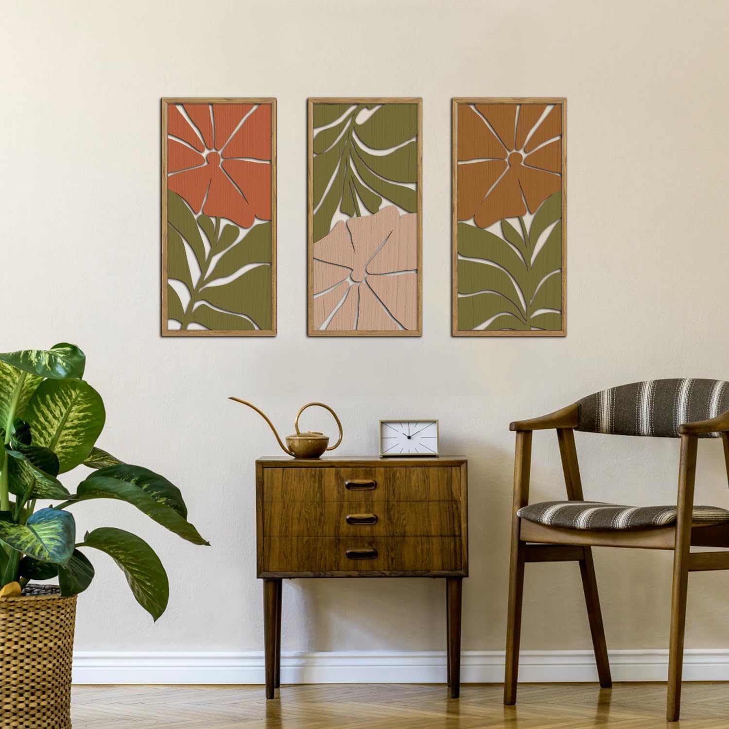 KAIRNE Boho Wooden Wall Art,Bohemian Wood Wall Decor Set of 3(16”X8”),Abstract Minimalist Hanging Decor,Vintage Farmhouse Bohemian Artwork for Living Room Bedroom Kitchen Office Decoration,Framed