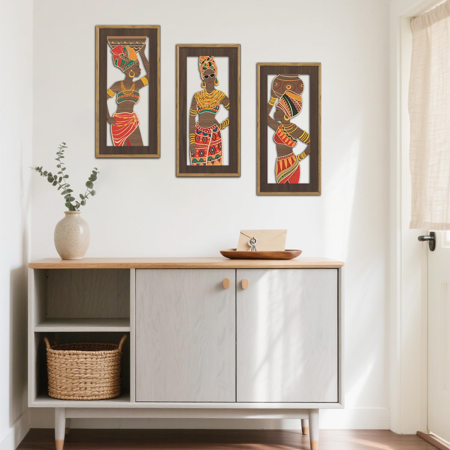 KAIRNE Abstract African American Wall Art,Black People Wooden Wall Art,Set of 3(8”X16”),Black Women Wood Hanging Decor,Traditional African Tribe Artwork for Living Room Kitchen Bedroom Decor,Framed