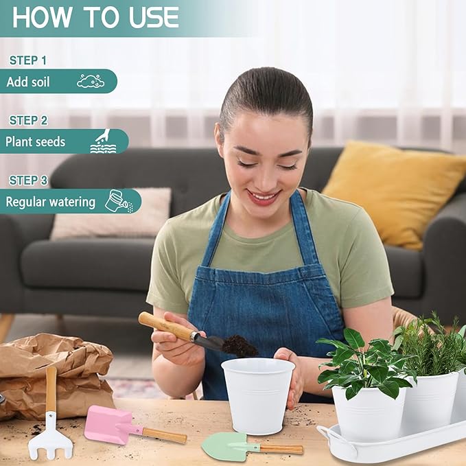 - Complete Herb Garden Planter Indoor Kit: In addition to three herb pots with trays, also three types of gardening tools. The combination of planting tools and flowerpots can help with quick planting. Made of high-quality materials, they are resistant to cracking, fading and weathering, and can be used for a long.
