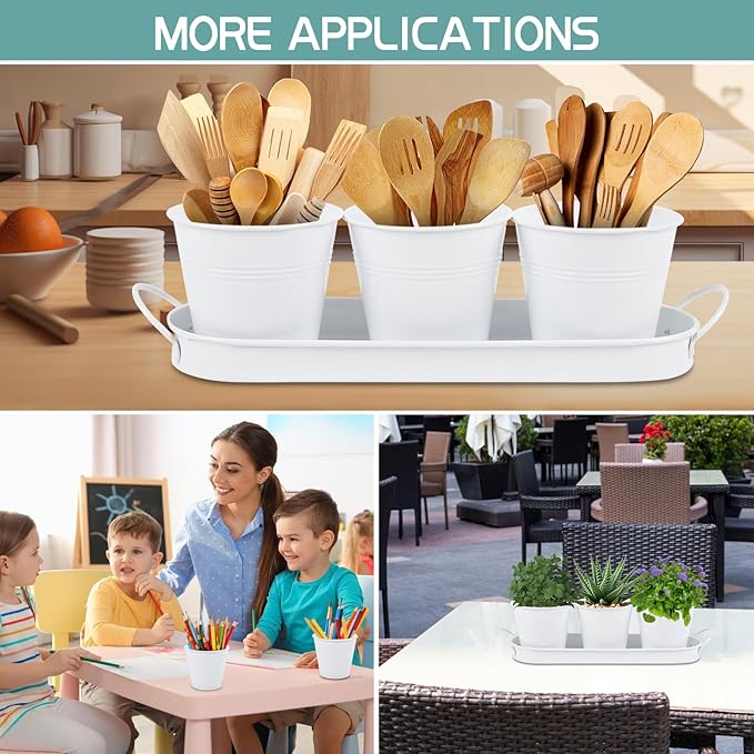 Indoor Herb Garden Set of 3 with Tray and 3 Types of Gardening Tools, Metal Plant Pots Herb Garden Planter Kit with Drainage for Plants (White)