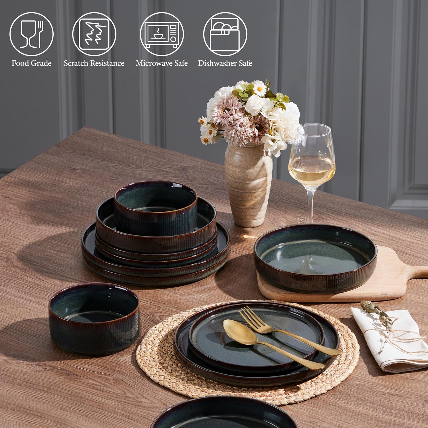 E-far 16 Piece Dinnerware Sets, Plates and Bowls with Pasta Bowls Service for 4, Modern Stoneware Ribbed Dishes for Kitchen Dining, Microwave & Dishwasher Safe, Blackish Green