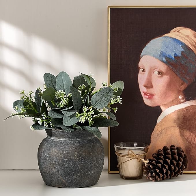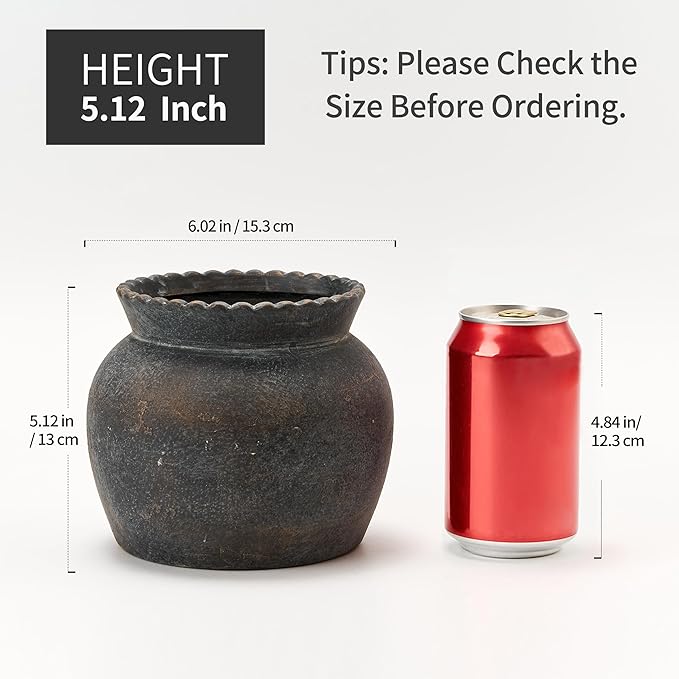 - ๐๐๐๐ฌ๐ฎ๐ซ๐๐ฆ๐๐ง๐ญ๐ฌ: The small rustic vase measures 5.12" height and 6" width with 4.3" opening.Perfect for greenery and dry or faux florals,but also can hold water for fresh flowers.The vase itself can be displayed indoors or outdoor as a fine decorative piece.
