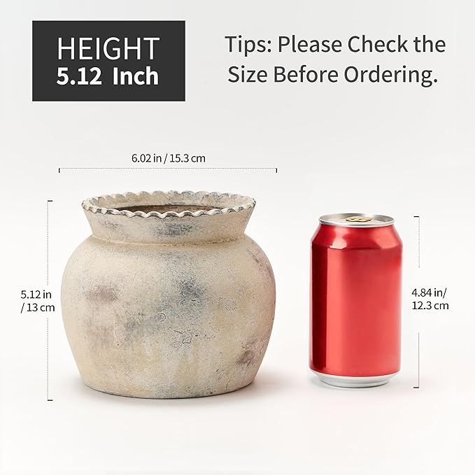 - ๐๐๐๐ฌ๐ฎ๐ซ๐๐ฆ๐๐ง๐ญ๐ฌ: The small rustic vase measures 5.12" height and 6" width with 4.3" opening.Perfect for greenery and dry or faux florals,but also can hold water for fresh flowers.The vase itself can be displayed indoors or outdoor as a fine decorative piece.