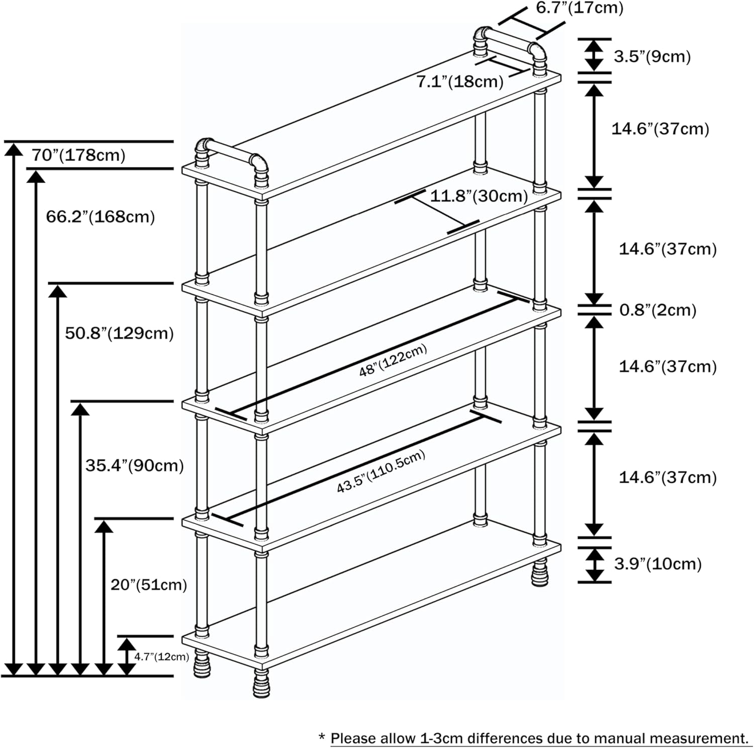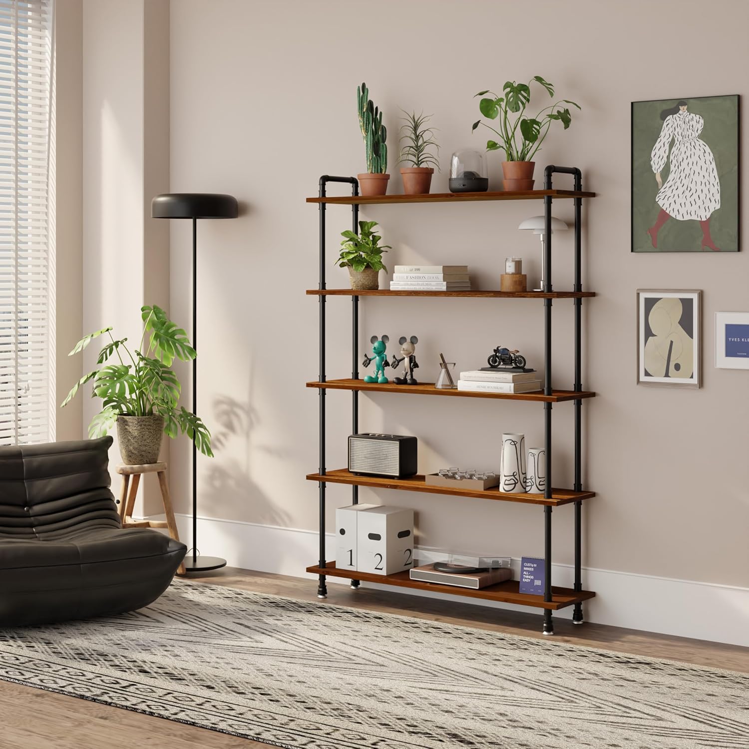 Industrial Bookshelf, 5-Tier Pipe Shelf, Wall Mounted Bookcase for Home and Office (Rustic Brown, 48" L x 11.8" W x 70" H)