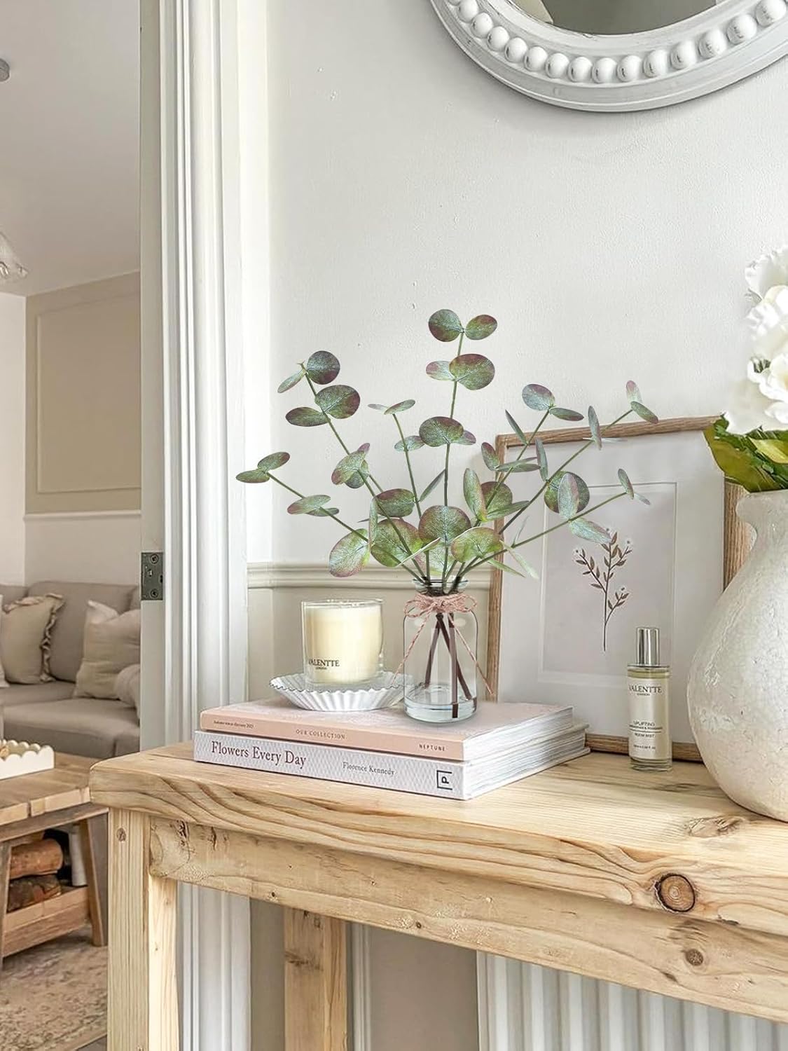 - Ideal Size: Artificial eucalyptus plant stems stand at 13.5 inches tall, paired with a glass vase measuring approximately 5.1×2.55×2.55 inches, making it suitable for any small corner of your home. Whether by the fireplace, on a bookshelf, or by the windowsill, it seamlessly integrates, adding a touch of natural greenery to various spaces.