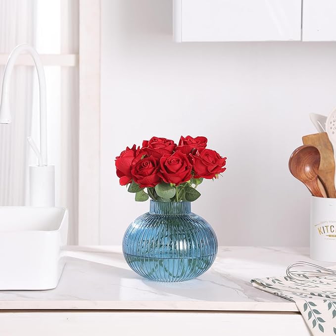 Blue Glass Vase for Tulips, Ribbed Glass Vase for Flowers, Round Flower Vases, Small Short Vases for Living Room, Office, Coffee Table, Shelf, Wedding, 6 Inches