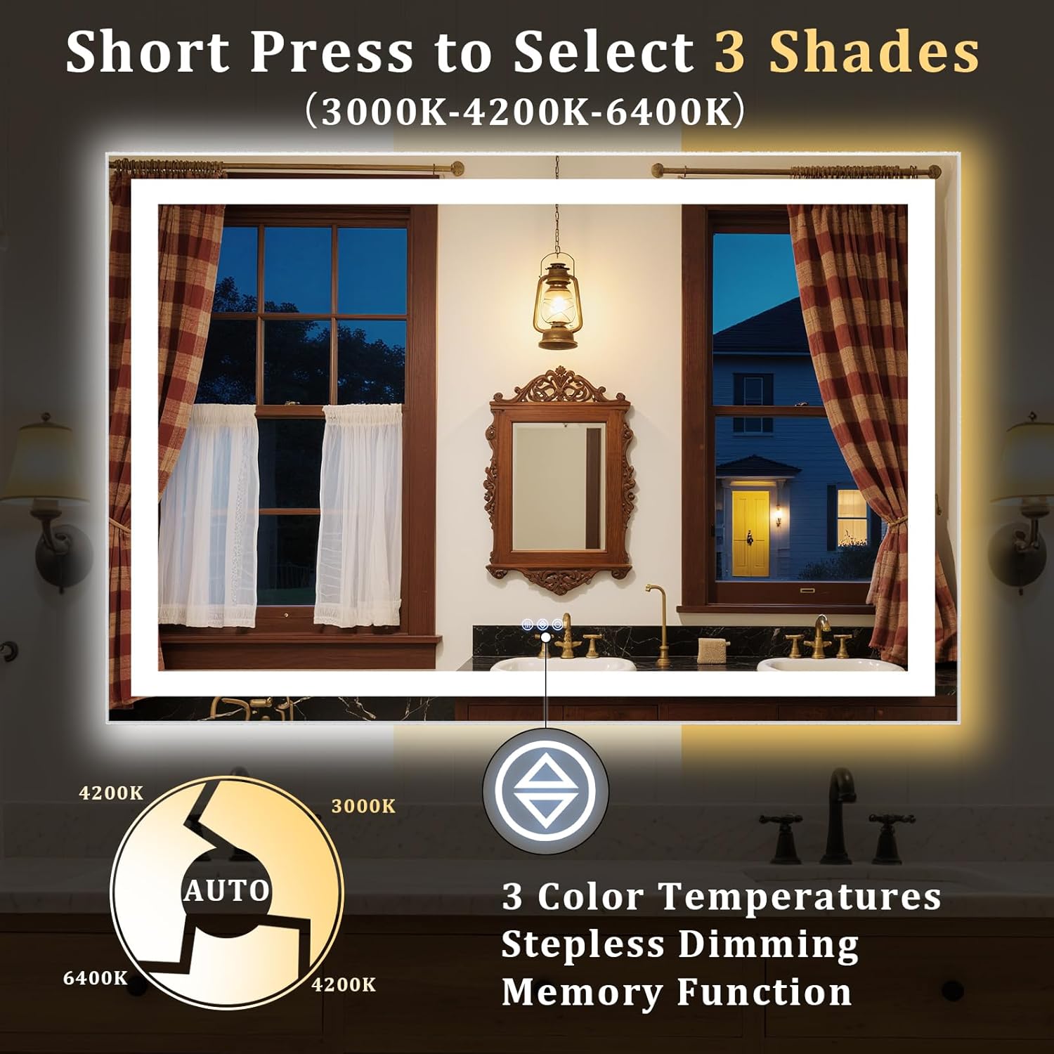 - Professional Lighting: Control your perfect lighting. The bathroom mirror features integrated front & backlight system for higher brightness, and offers three color lights (warm-light, natural-light, cool-light) and adjustable brightness from 10% to 100%. Short press can adjust the color according to the usage situation, while long press can adjust the brightness of the lights, allowing you to have salon level control over any task or emotion