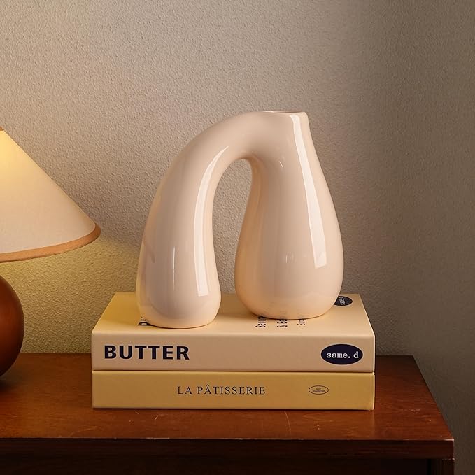 White Ceramic Decorative Pitcher Vase, 7.5 in – Glossy Sculptural Arch-Handle, Modern Home Décor Accent for Fresh or Dried Floral Arrangements, Table/Shelf/Entryway, Giftable
