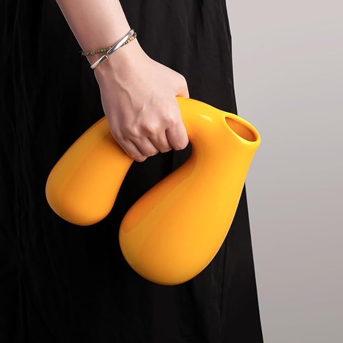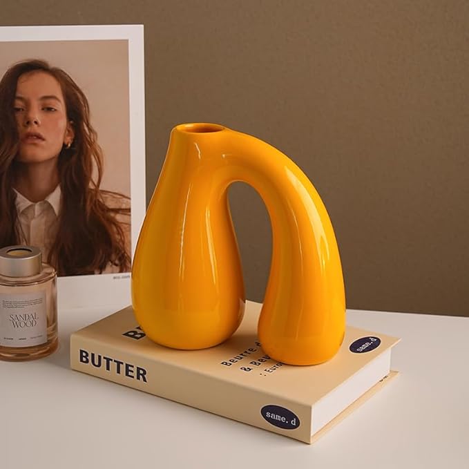 Yellow Ceramic Decorative Pitcher Vase, 7.5 in – Glossy Sculptural Arch-Handle, Modern Home Décor Accent for Fresh or Dried Floral Arrangements, Table/Shelf/Entryway, Giftable