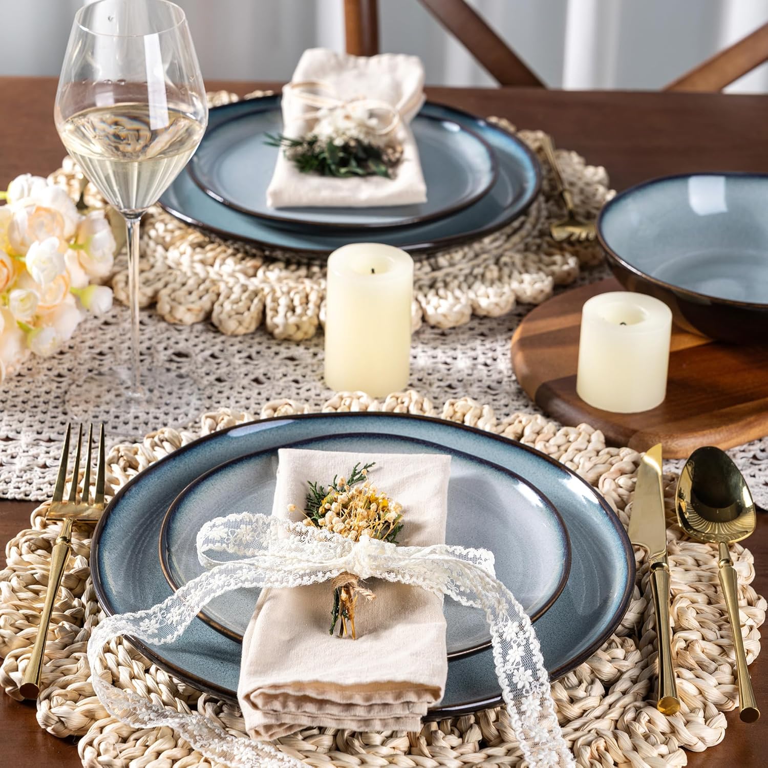 - 【UNIQUE AND SCRATCH RESISTANT】Our plates are fired with two different glazes,The reactive glaze make every plate is unique,Since our glaze is all-natural reactive finish, the surface of plates would change color on lighting,So Our glaze is also extra strong to prevent scratches from your knives and forks