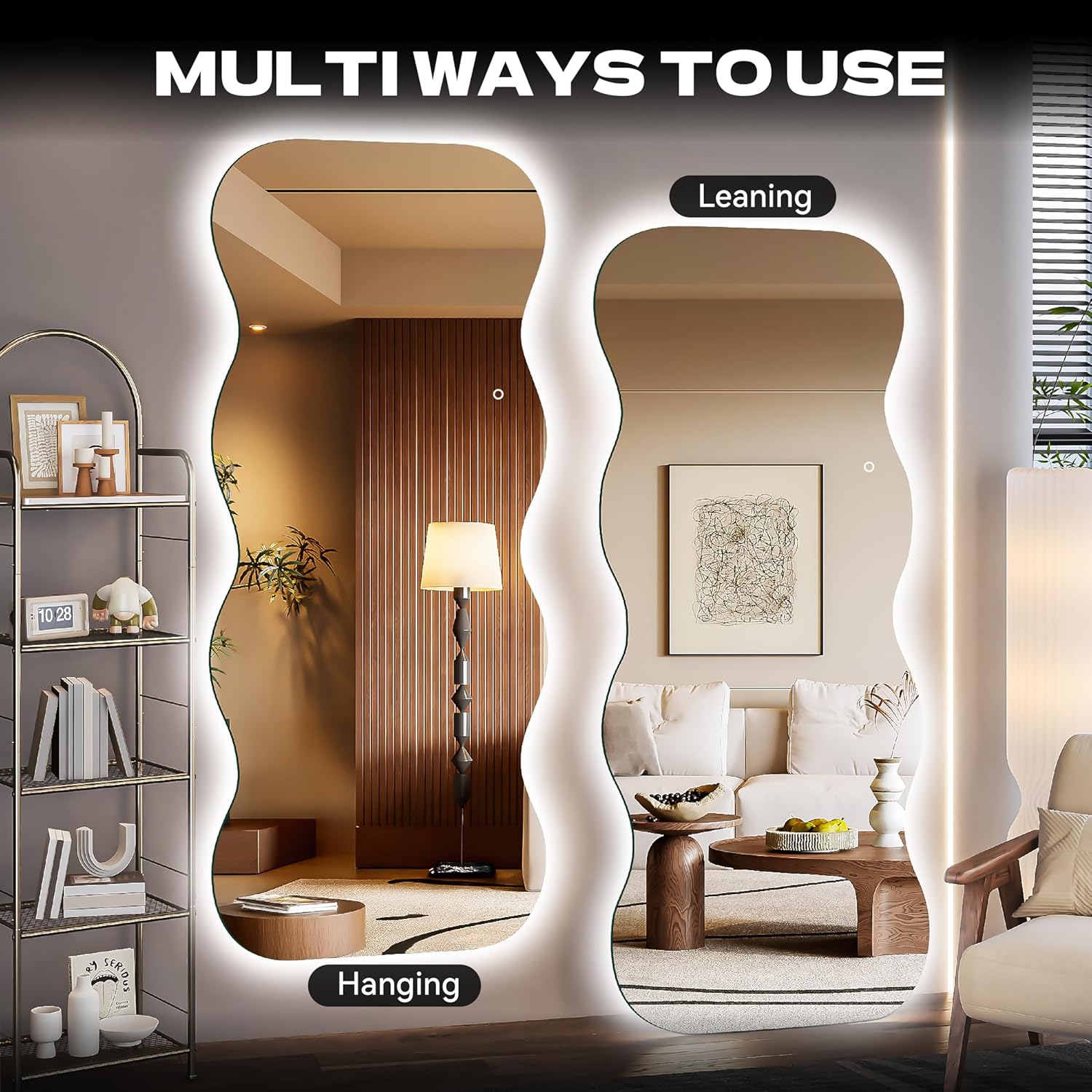- Modern Functional Decor Statement- More than a mirror, it’s a statement piece. The elegant wave design and integrated lighting make this LED wavy wall mirror a functional decor upgrade for modern, farmhouse, or glam interiors, perfect as a full-length leaning or mounted vanity mirror for wall.