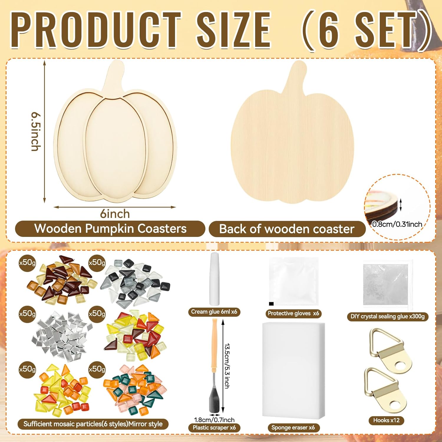 - Complete Kit: our DIY mosaic crafts kit package provides everything you need: 50g caulk, 6ml glue, disposable gloves, hooks, sponges, flat-head scrapers, a total of 6 sets, each mosaic glass block is 50g, and there are 6 pumpkin coasters with a diameter of 16.5 cm; This full set ensures a seamless crafting experience, making it an ideal choice for anyone looking to explore their creative side