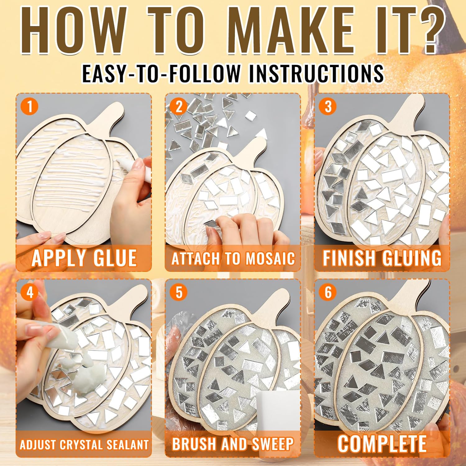 - Effortless Installation: apply glue to the mosaic tile kit, then use a scraper to stick the mosaic pieces to the product, wait for the mosaic crafts kit to air dry, mix the caulk with water to make it sticky, then apply the pumpkin coaster, then put on disposable gloves, wipe off the excess caulk with a sponge, wait for it to dry, and the glass mosaic kit is complete; Completing your mosaic Crafts project is as enjoyable as it is straightforward