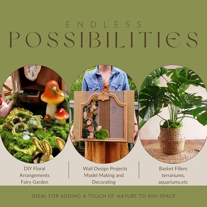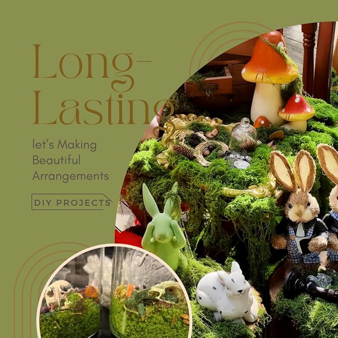 - WIDE-USE FAUX MOSS: Simply fluff and go! Perfect for terrariums, fairy gardens, miniature displays, and event decor. Elevate your projects with this versatile moss decor today! Whether you're working on terrariums, potted plants, glass containers, wall art, or model-making crafts, USMOLA Green Moss for Decorating serves as the perfect solution!