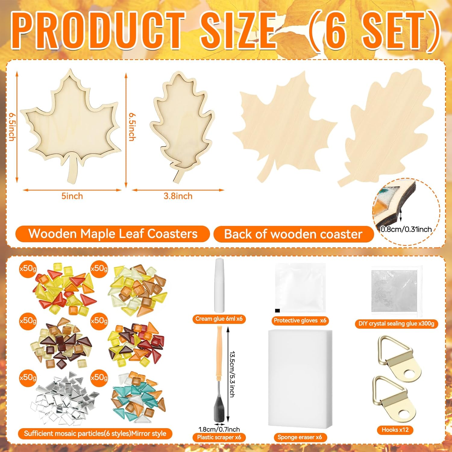 - Complete Kit: our DIY mosaic crafts kit package provides everything you need: 50g caulk, 6ml glue, disposable gloves, hooks, sponges, flat-head scrapers, a total of 6 sets, each mosaic glass block is 50g, and there are 6 maple leaf coasters with a diameter of 16.5 cm; This full set ensures a seamless crafting experience, making it an ideal choice for anyone looking to explore their creative side