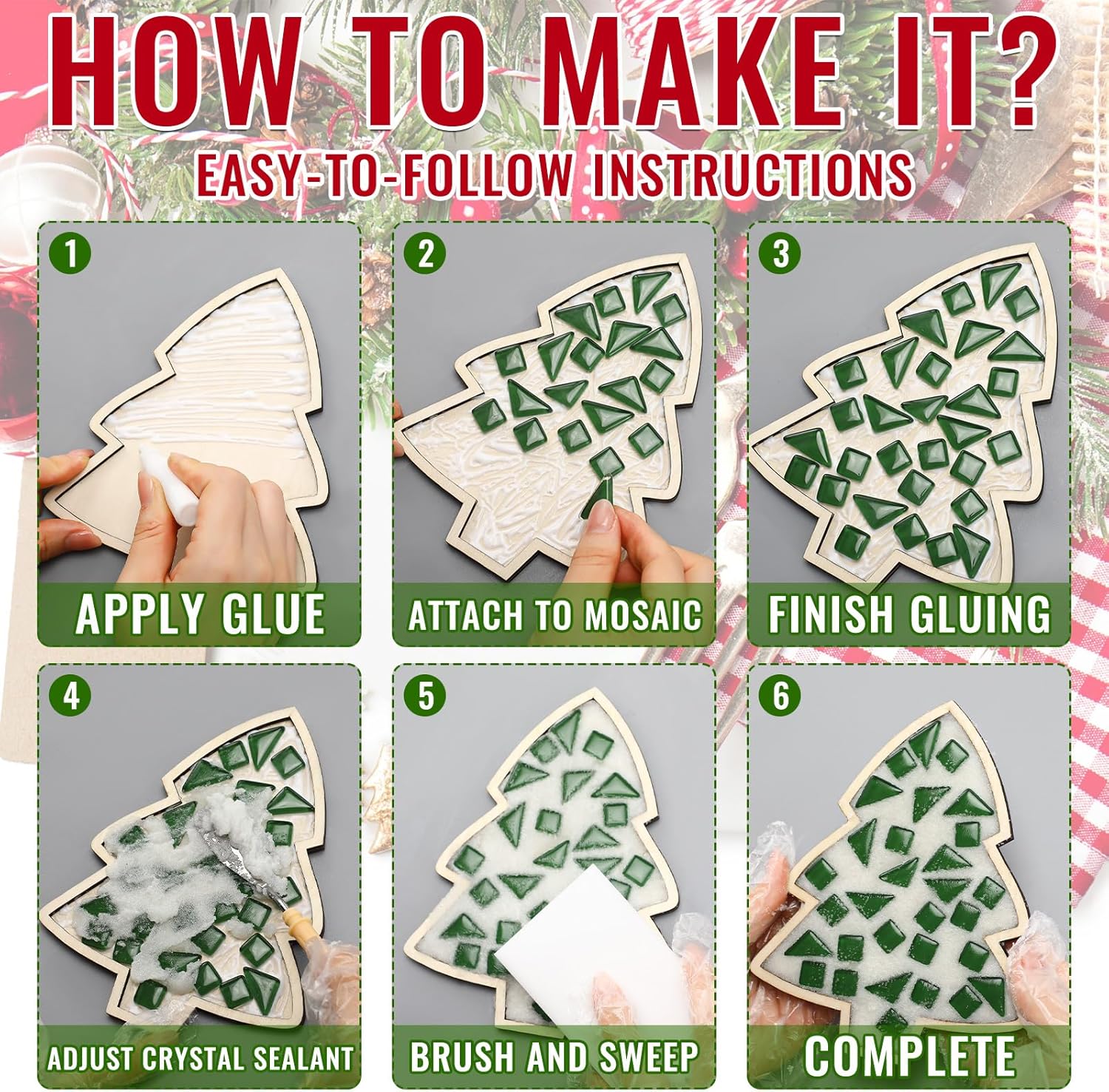 - Effortless Installation: apply glue to the mosaic tile kit, then use a scraper to stick the mosaic pieces to the product, wait for the mosaic crafts kit to air dry, mix the caulk with water to make it sticky, then apply the Xmas Tree coaster, then put on disposable gloves, wipe off the excess caulk with a sponge, wait for it to dry, and the glass mosaic kit is complete; Completing your mosaic crafts project is as enjoyable as it is straightforward