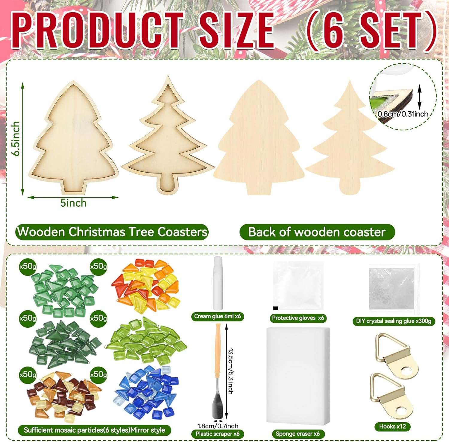 - Complete Kit: our DIY mosaic crafts kit package provides everything you need: 50g caulk, 6ml glue, disposable gloves, hooks, sponges, flat-head scrapers, a total of 6 sets, each mosaic glass block is 50g, and there are 6 Christmas Tree coasters with a diameter of 16.5 cm; This full set ensures a seamless crafting experience, making it an ideal choice for anyone looking to explore their creative side