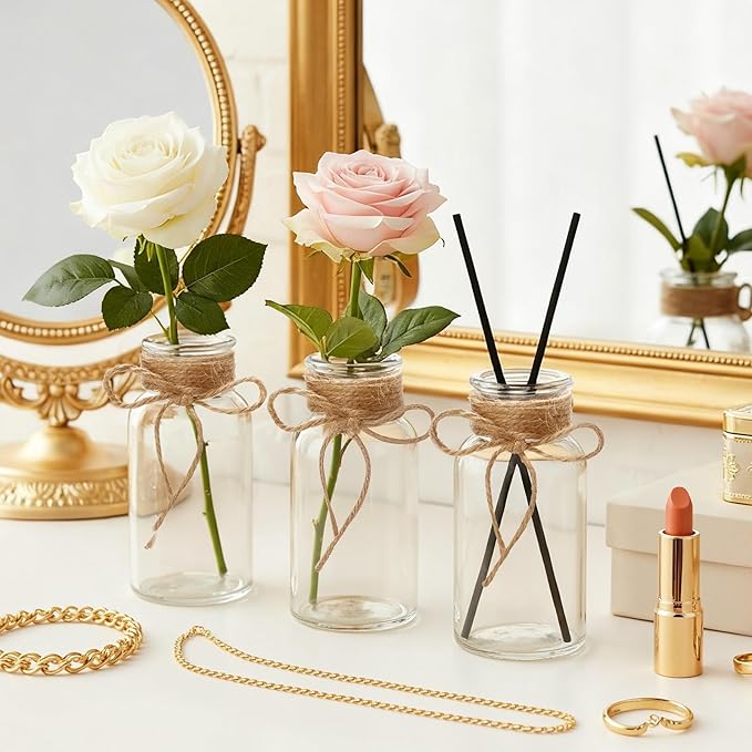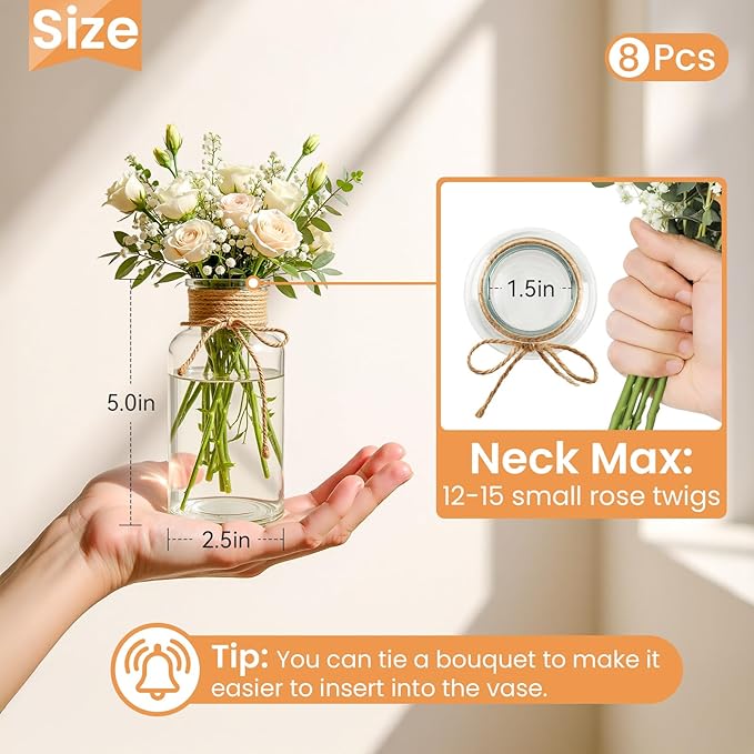 - 【All-in-One Bulk Set】 Comes with 8 clear glass vases (2.5″ D × 5″ H)—perfect for clustering on tables, dessert stations, or shelf displays. Use individually or as a group for maximum impact.