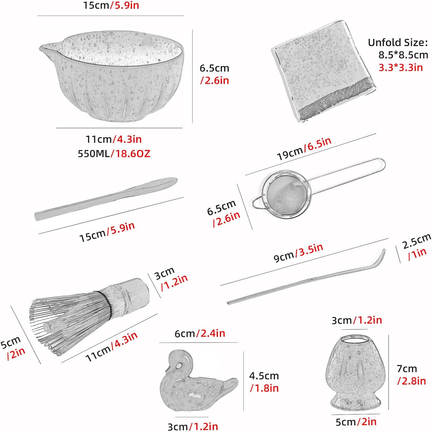 - PREMIUM CEREMONY SET. It is 7 pcs / set, Contain:: 1* Bamboo Whisk, 1* Bamboo Scoop (Chashaku), 1*Ceramic Bowl (Chawan) 550 ml/18 oz, 1* Cermaic Whisk Holder. 1* Ceramic Scoop Stand, 1* Cotton Tea Cloth (Chakin), 1* Matcha Powder Sifter. This kit makes it very easy to adopt matcha as a lifestyle