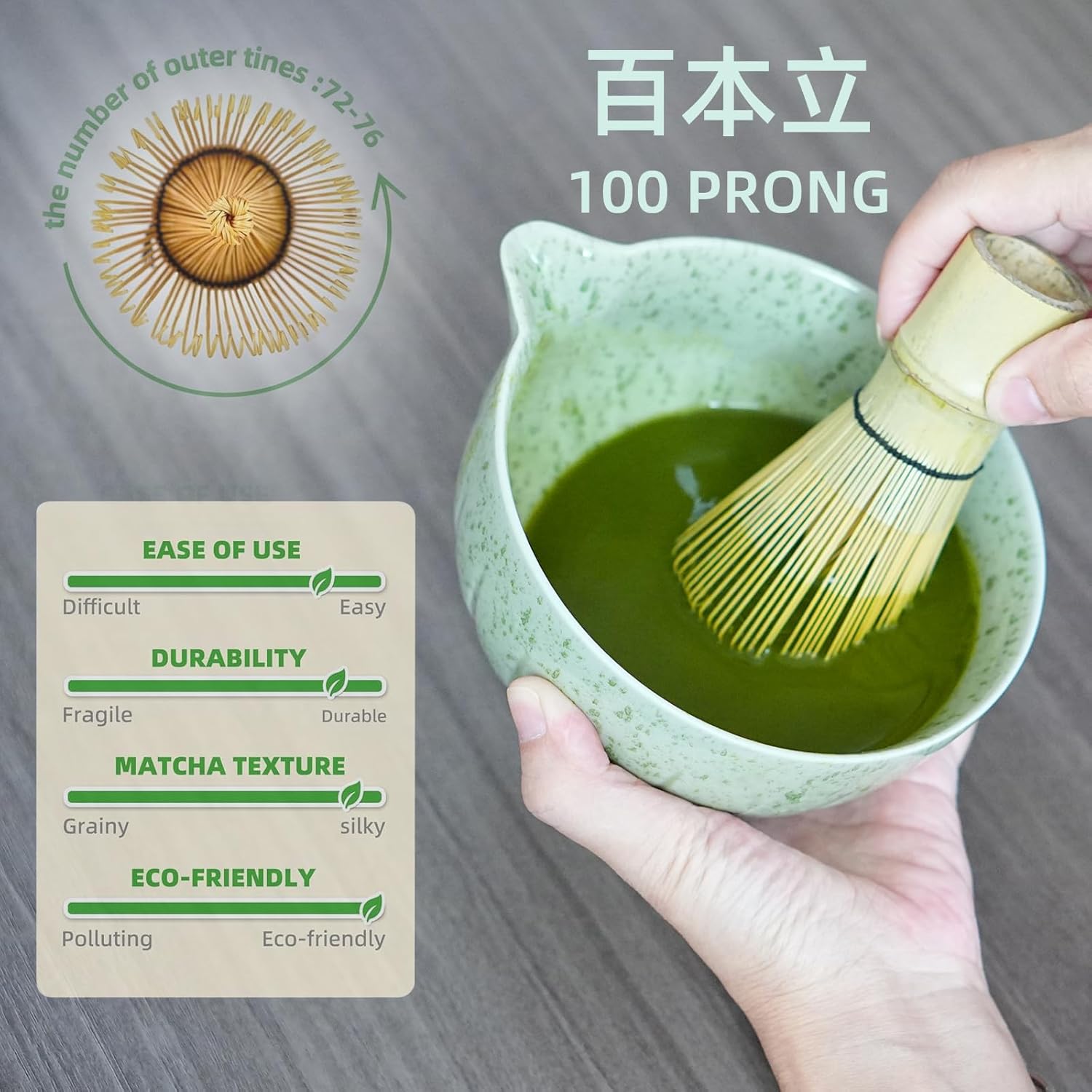- 100 Bristle Bamboo Whisk: We made our 100-bristle matcha whisks from natural, mature bamboo. It can give matcha a rich, frothy texture by fully blending matcha powder with warm water to create delectable thin matcha. (Tea whisk is consumable and needs to be replaced when necessary)