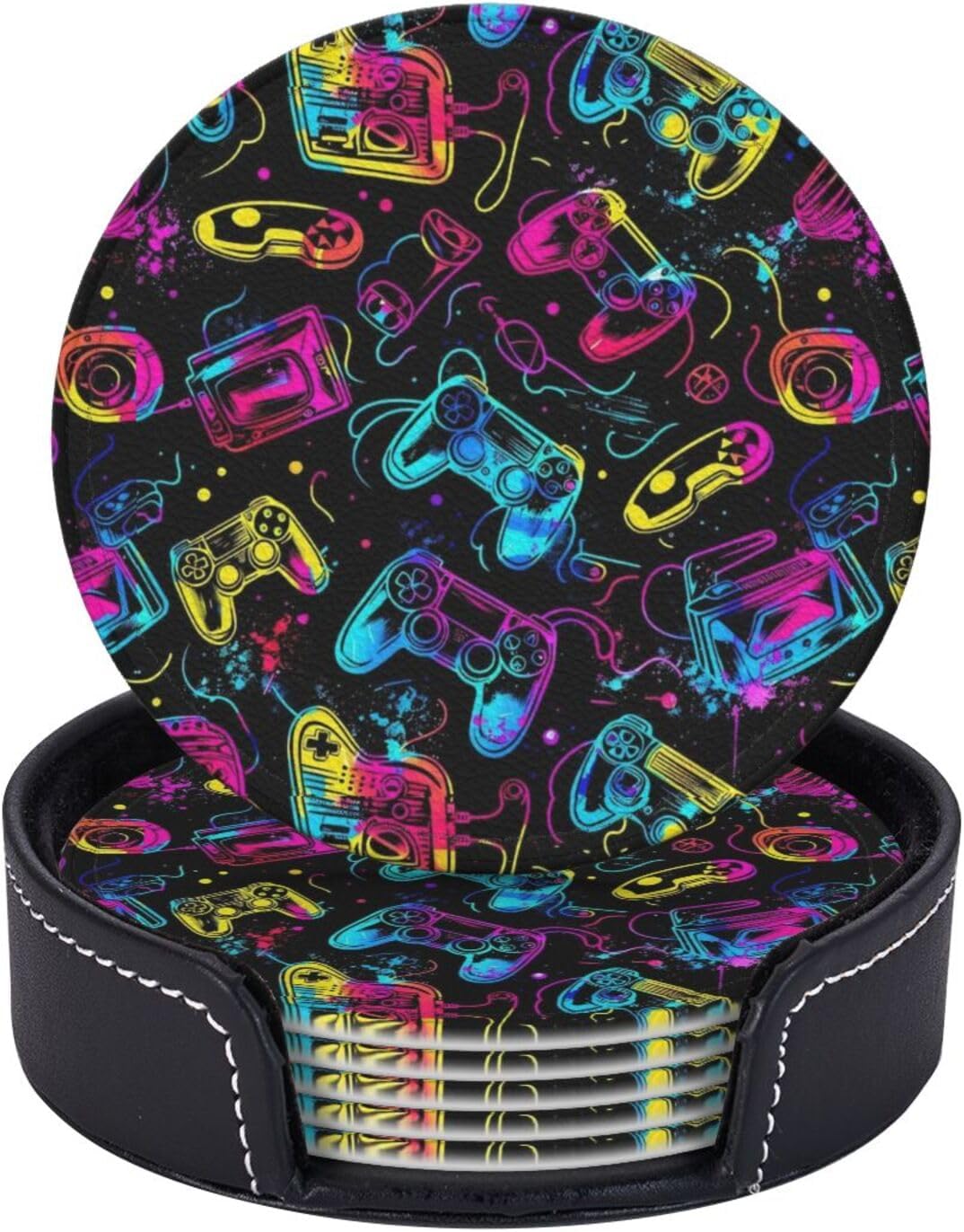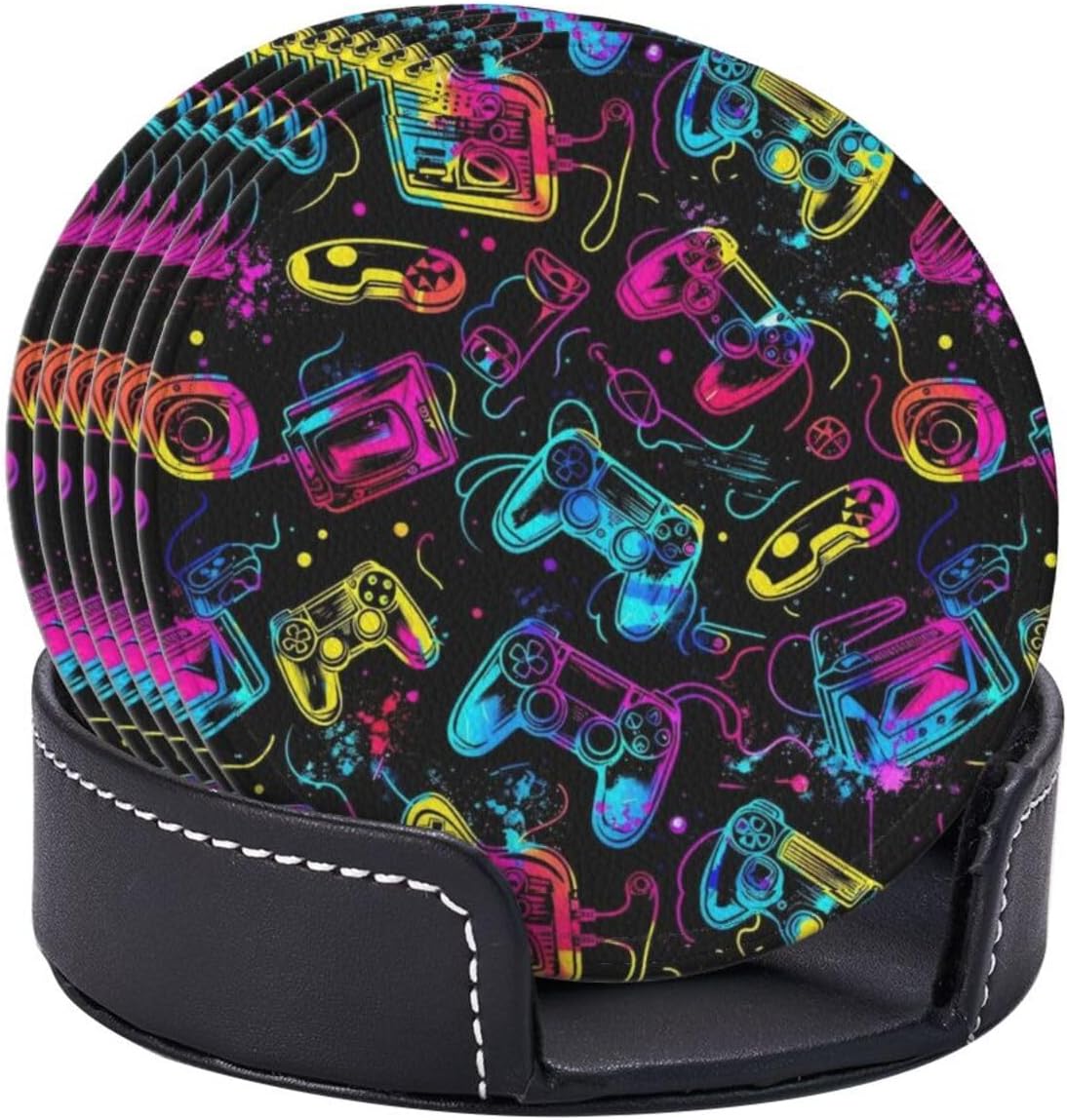 Drink Coasters with Holder Stand Set of 6, Bright Game Controller Pu Leather Absorbent Coasters with Cork Base Table Coaster Round Coasters for Housewarming Apartment Kitchen Bar Decor