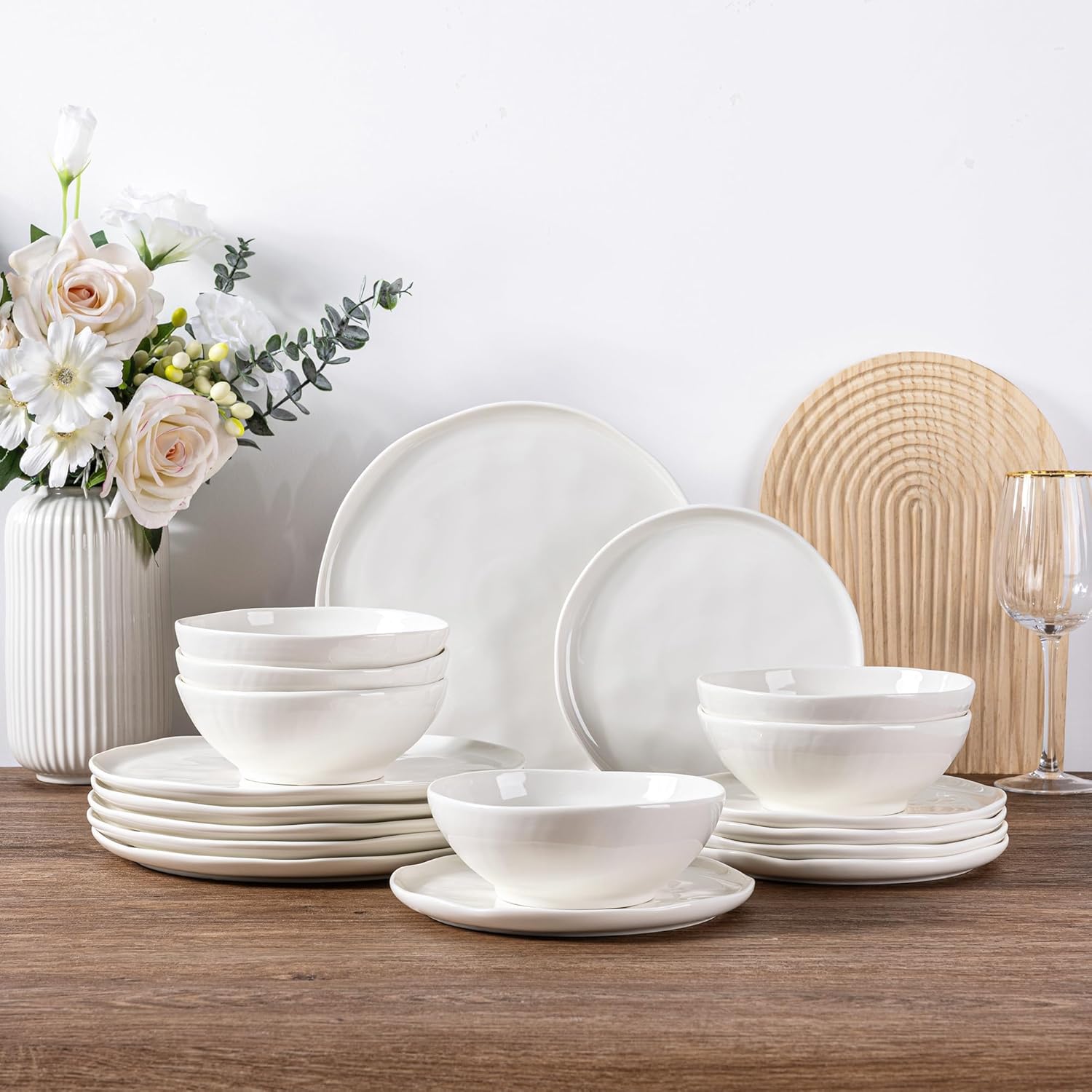 LERATIO Ceramic Dinnerware Sets for 6,Porcelain Plates and Bowls Sets with Wavy Edge, Oven &Microwave & Dishwasher Safe,Light Weight & Scratch Resistant Dishes Sets-Service for 6 (18pcs)-Peal White