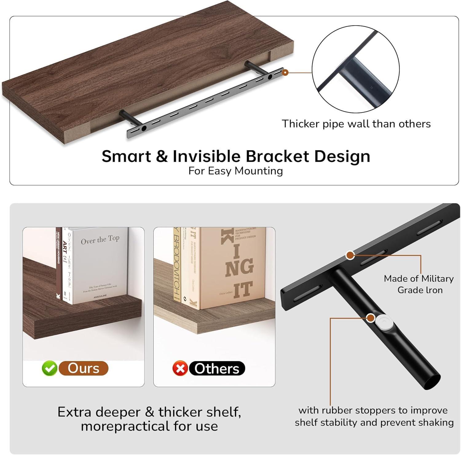 - Extra Deeper & Thicker - Each board measures 36"W x 12"D x 1.8"H. Extra deeper and thicker design in order to bring maximizes storage space and weight capacity, even hold up to 70 lb each. This floating shelf taking up zero square feet, reduces clutter and highlights décor in compact spaces.