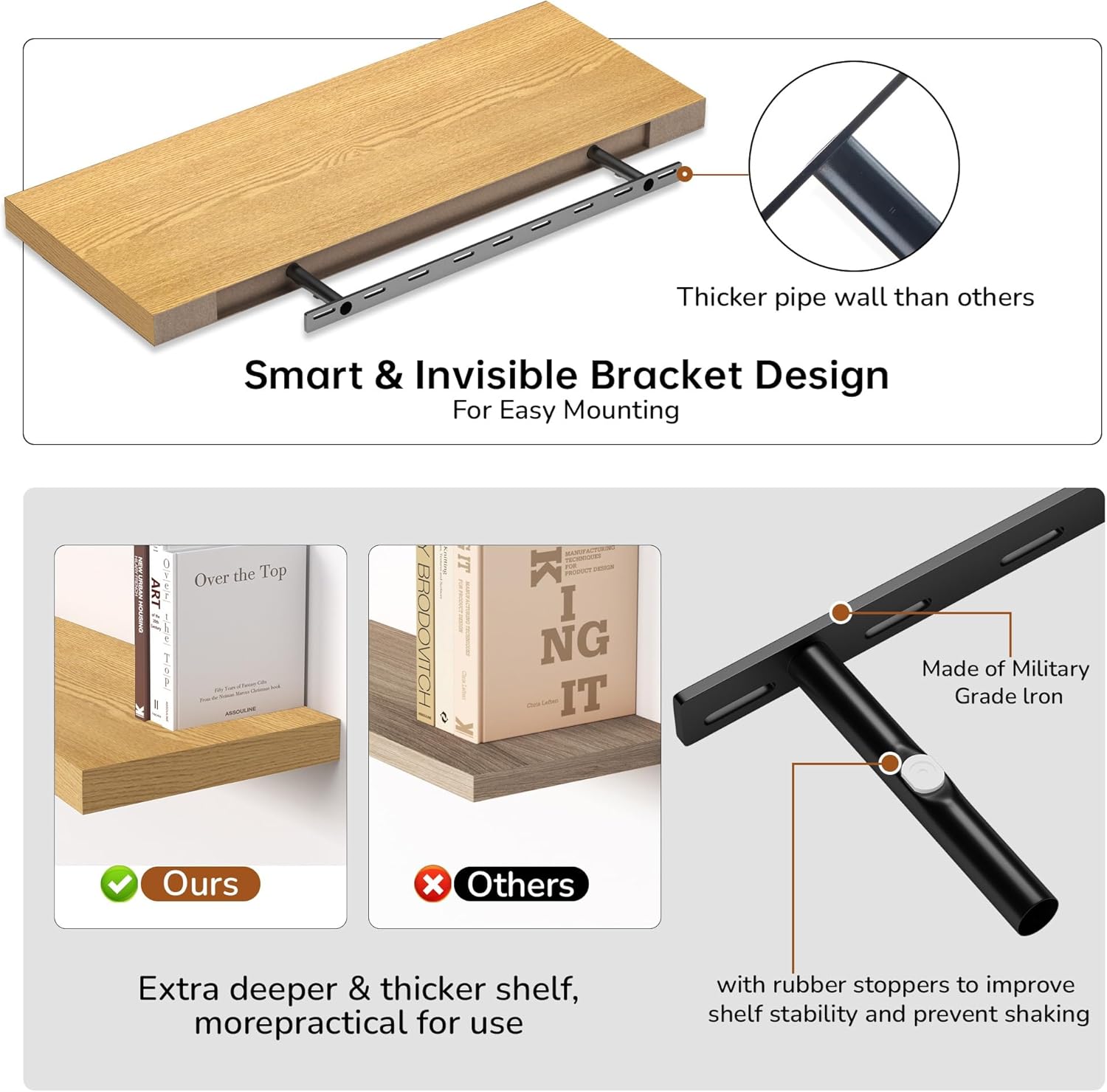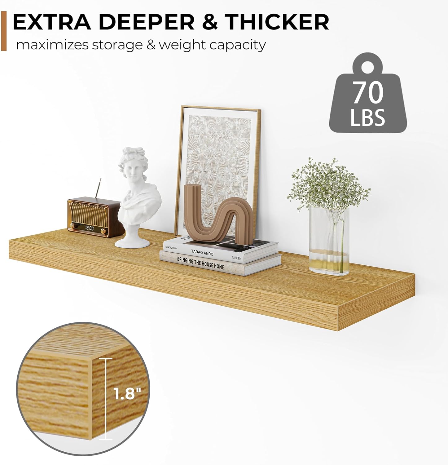 - Extra Deeper & Thicker - Each board measures 36"W x 12"D x 1.8"H. Extra deeper and thicker design in order to bring maximizes storage space and weight capacity, even hold up to 70 lb each. This floating shelf taking up zero square feet, reduces clutter and highlights décor in compact spaces.