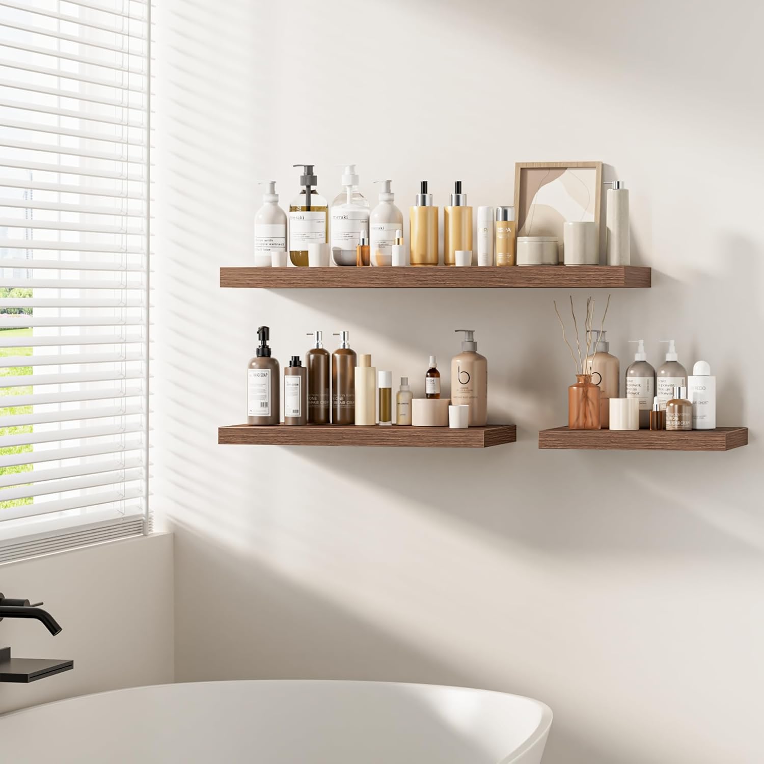 - Versatile & Multi-Scene Functionality: Our floating shelves are available in a variety of sizes and thicknesses, allowing you to choose the perfect fit for your space. Use them in the bathroom to store beauty products, hair care items. In the bedroom, they can hold books, cosmetics, and personal items. In the kitchen, they’re perfect for spices, jars, or small utensils. Or display photo frames, trophies, or collections in the living room. These shelves efficiently use wall space to create a tidier, more spacious feel in any room.