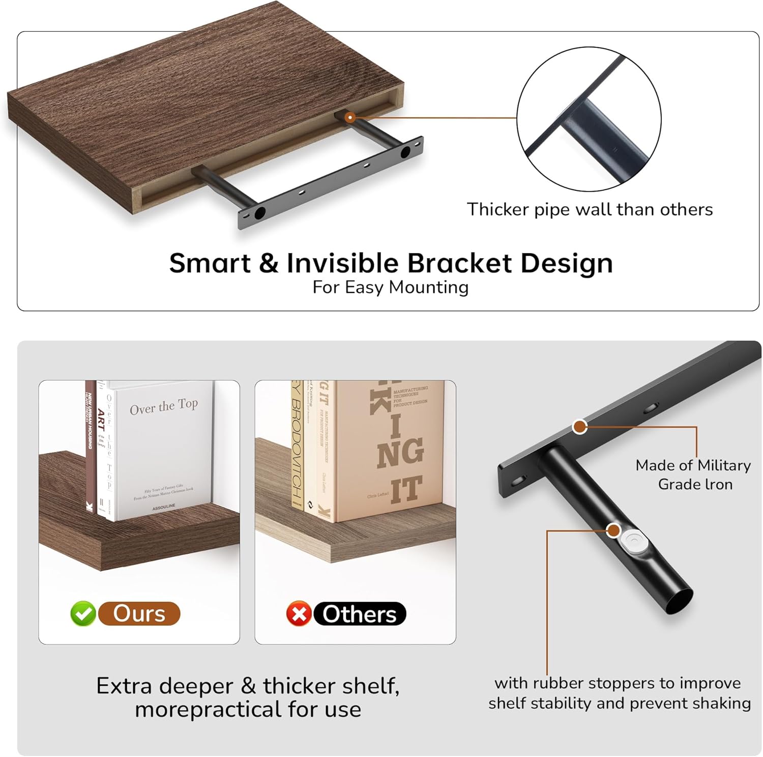 - Extra Deeper & Thicker - Each board measures 16"W x 12"D x 1.5"H. Extra deeper and thicker design in order to bring maximizes storage space and weight capacity, even hold up to 30 lb each. This floating shelf taking up zero square feet, reduces clutter and highlights décor in compact spaces.