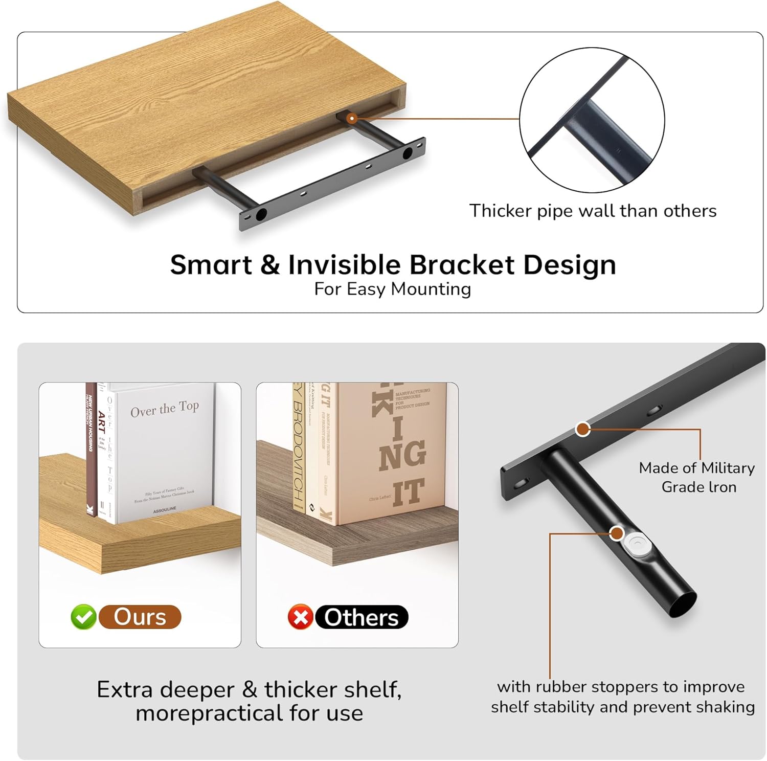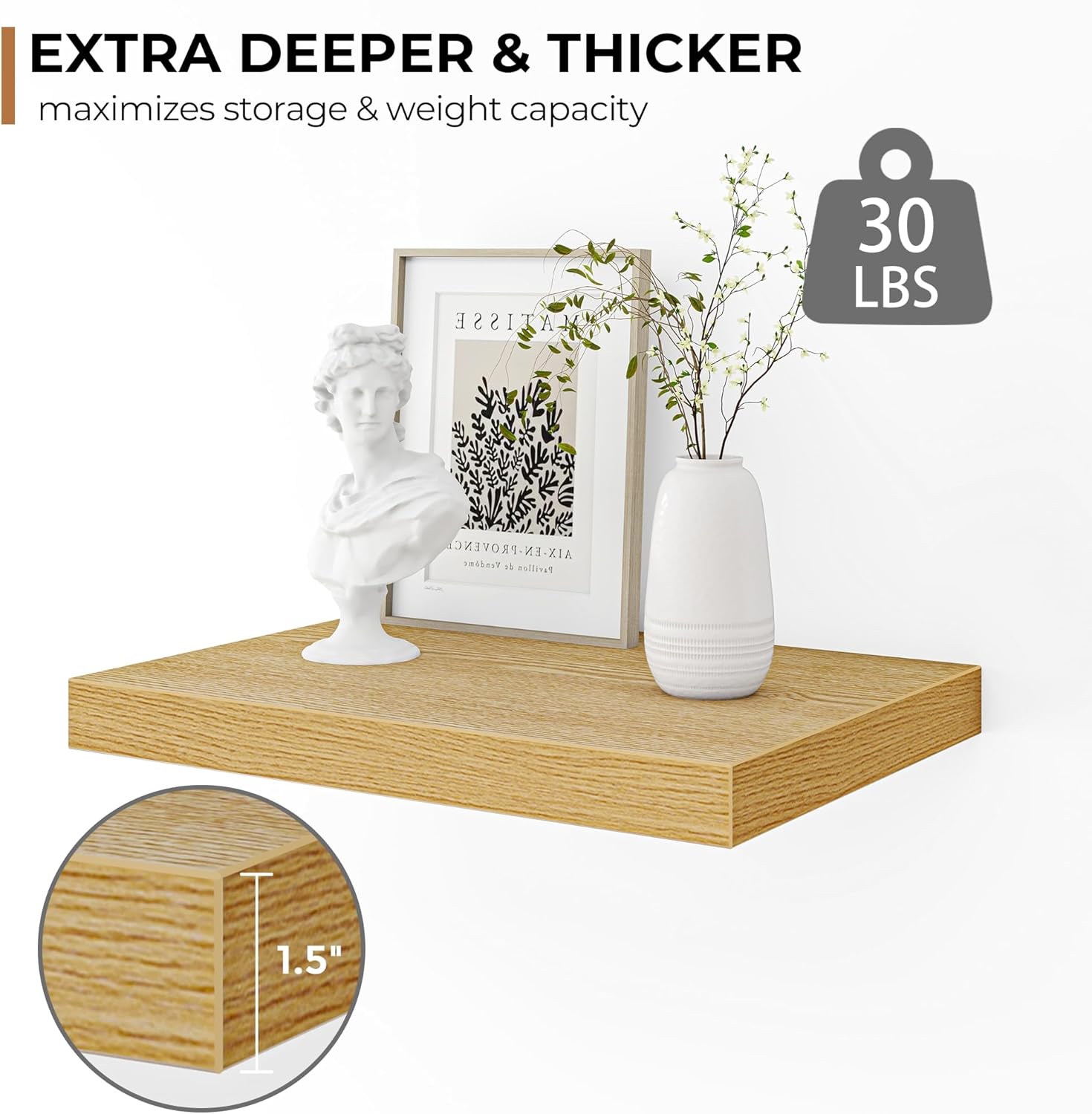 - Extra Deeper & Thicker - Each board measures 16"W x 12"D x 1.5"H. Extra deeper and thicker design in order to bring maximizes storage space and weight capacity, even hold up to 30 lb each. This floating shelf taking up zero square feet, reduces clutter and highlights décor in compact spaces.