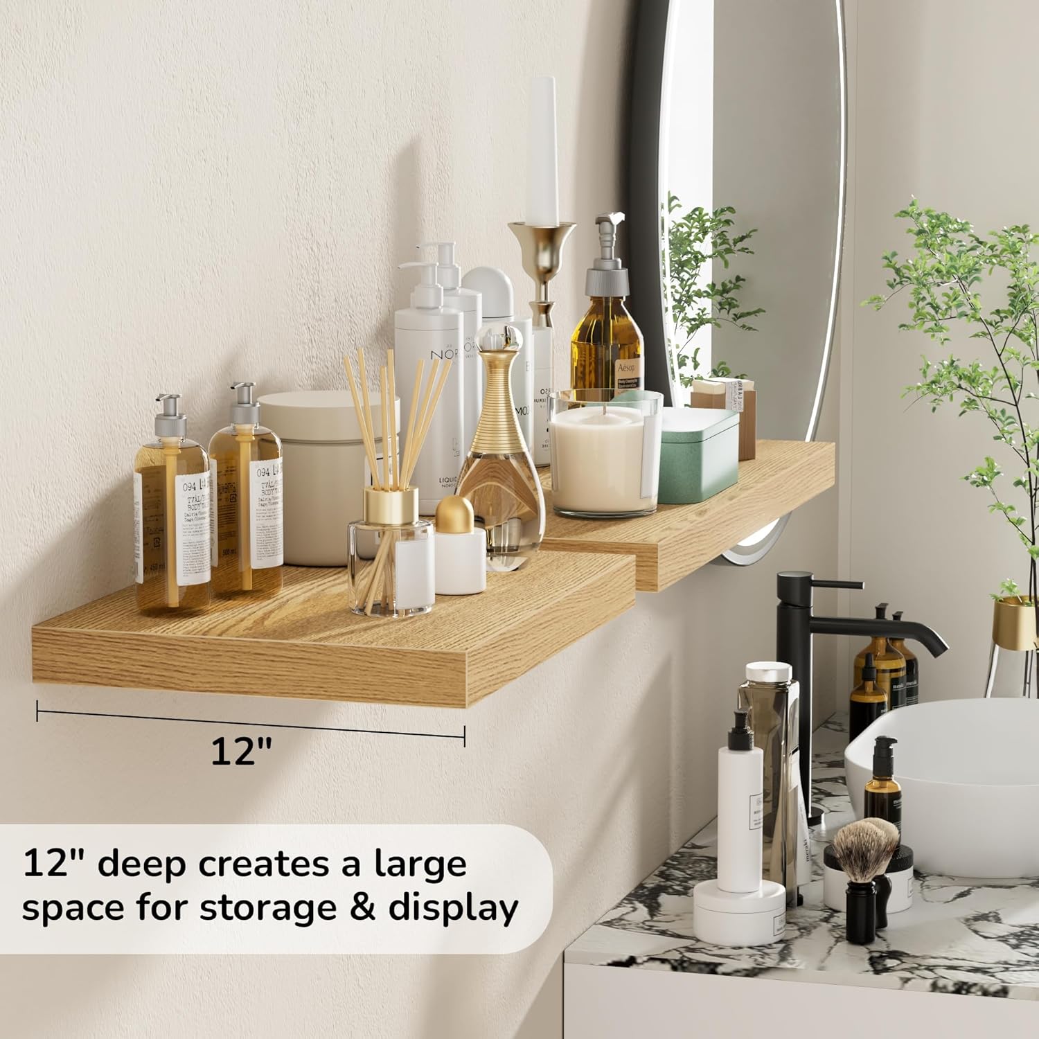 Fun Memories Floating Shelves - 2 Pack 12 Inch Rustic Wooden Wall Shelves - Extra Deeper & Thicker Wall Mounted Storage Shelf for Living Room, Kitchen, Farmhouse - 16" W x 12" D x 1.5" H - Oak