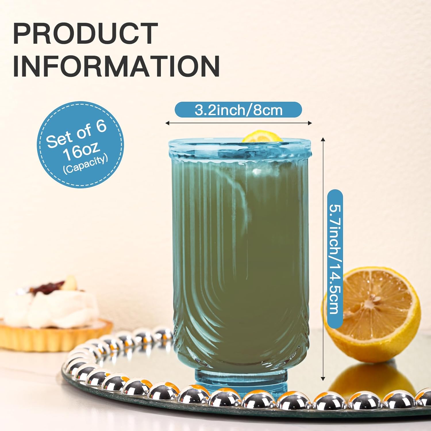 - [Elegant Arched Ripple Design] Inspired by art deco architecture, this Blue Vintage Glassware Set of 6-17Oz features a unique arched ripple texture that adds depth, grip, and vintage charm. The raised pattern gives these Art Deco Ripple Highball Glasses a distinctive appearance that elevates any table setting.