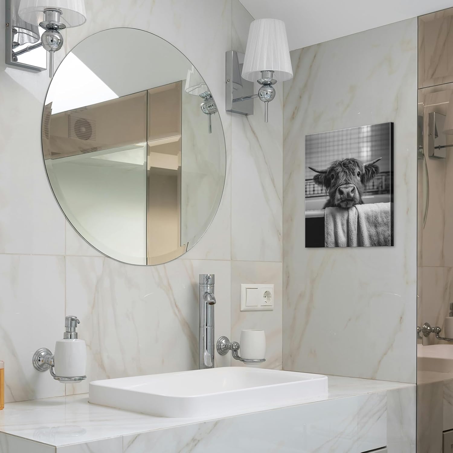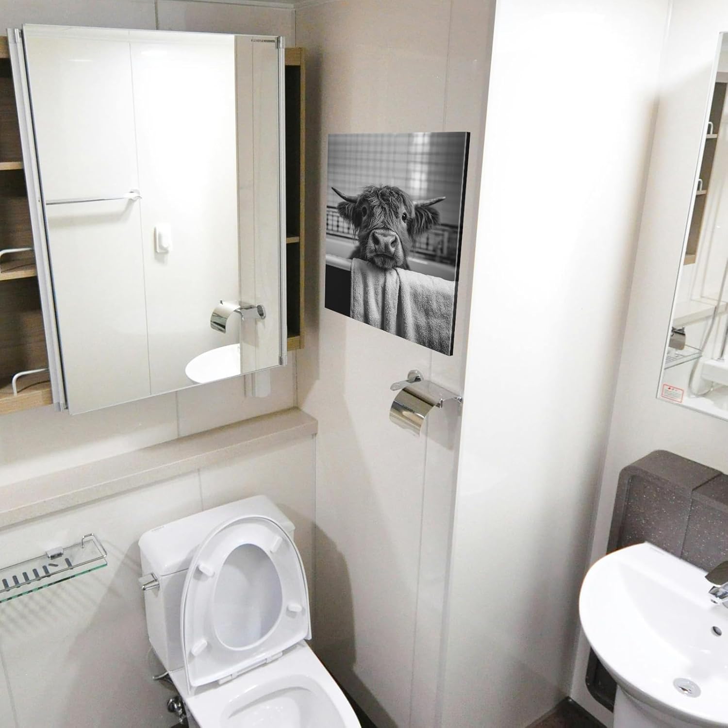 Highland Cow Canvas Wall Art Funny Animal Bathroom Pictures with Wooden Frame, Ready to Hang Lightweight Bathroom Wall Decor for Home, Funny Art and Highland Cow Pictures, Size 12x15.7 Inch
