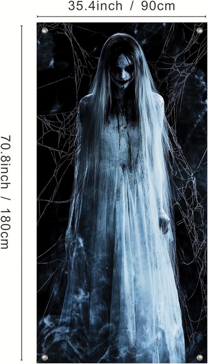 - Halloween Door Cover: This creepy Halloween door cover features a spooky ghost with blood-red eyes and spider webs, perfect for your haunted house theme.