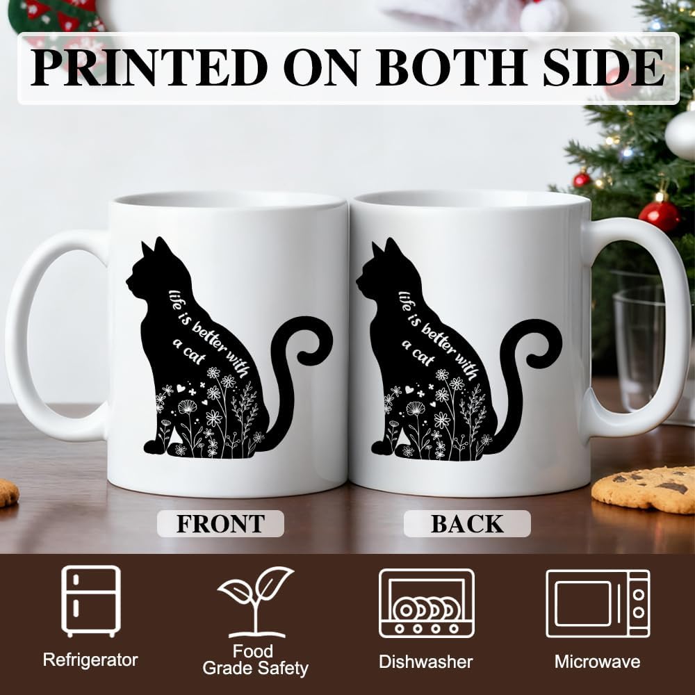 Life Is Better With A Cat Ceramic Coffee Mug for Women Men, Funny 11oz Floral Black Cat Mug for Cats Dad Mom, Cats Lover Gifts, Novelty Mothers Day Christmas Birthday Gifts