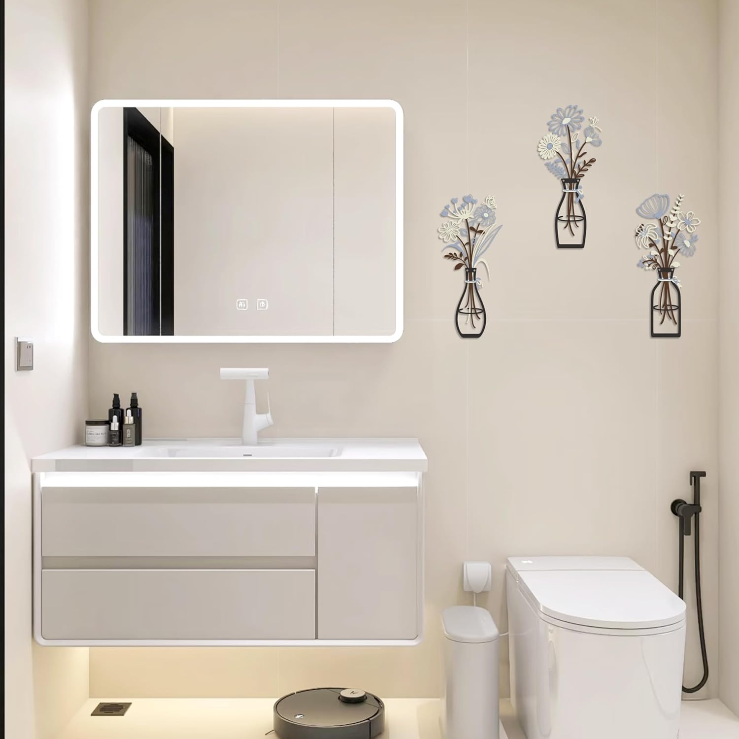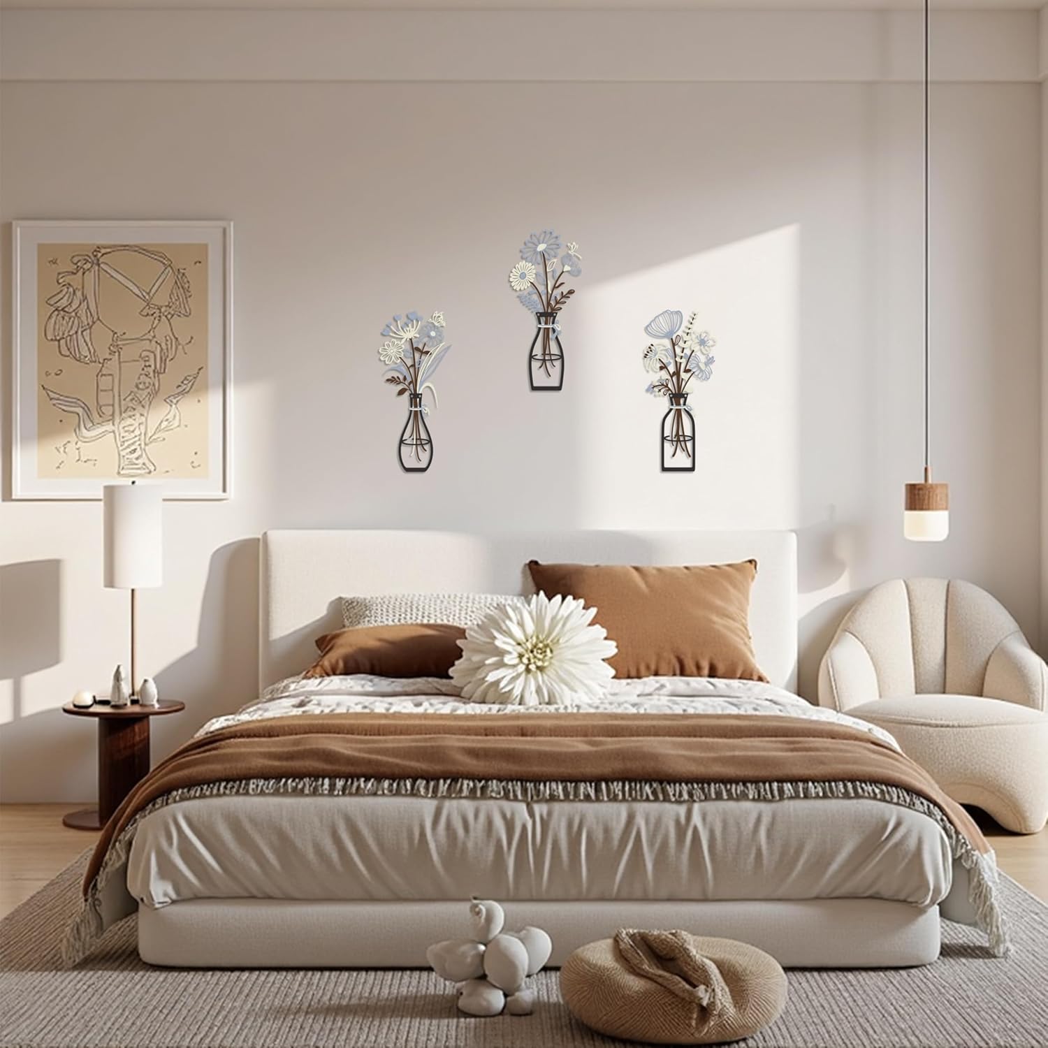 Iron Metal Vase Flower Wall Art Minimalist Black Floral Decor for Living Room Bedroom Kitchen, Office Garden - Modern Farmhouse Home Decor & Housewarming Gifts (Beige-Blue No Text)