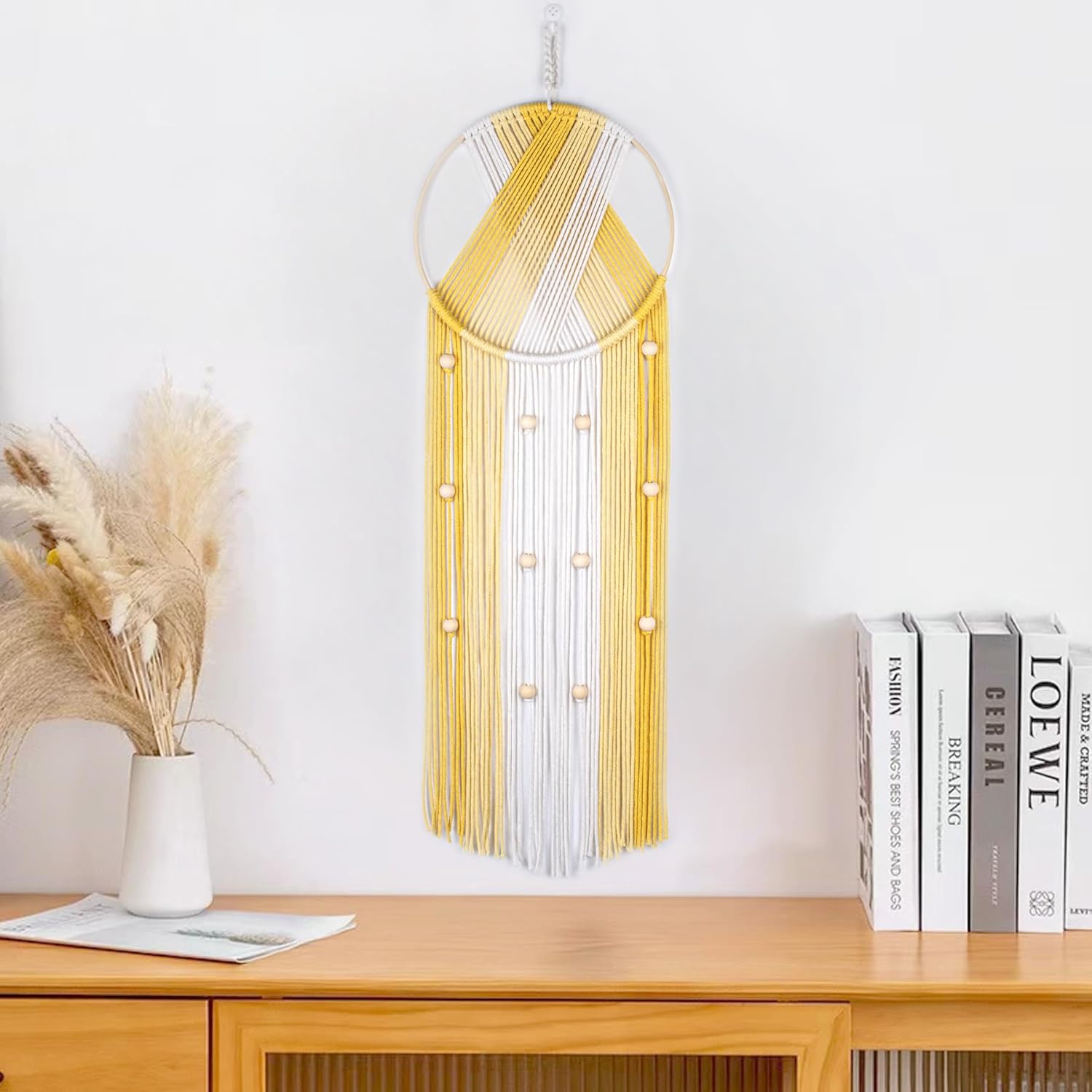 LB Boho Yellow Macrame Wall Hanging Handmade Woven Cotton Tapestry with Wood Board Modern Yellow and Beige Aesthetic Wall Decor for Home, Bedroom, Living Room