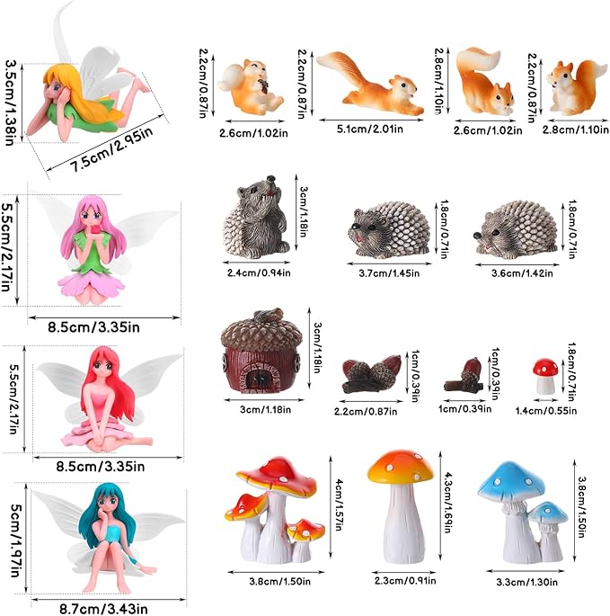 - Complete 20-Piece Fairy Garden Set: Create a complete enchanted scene with 4 flower fairies, 4 squirrels, 3 hedgehogs, 6 mushrooms, 2 pine cones, 1 pine cone house garden accessories—no additional purchases needed