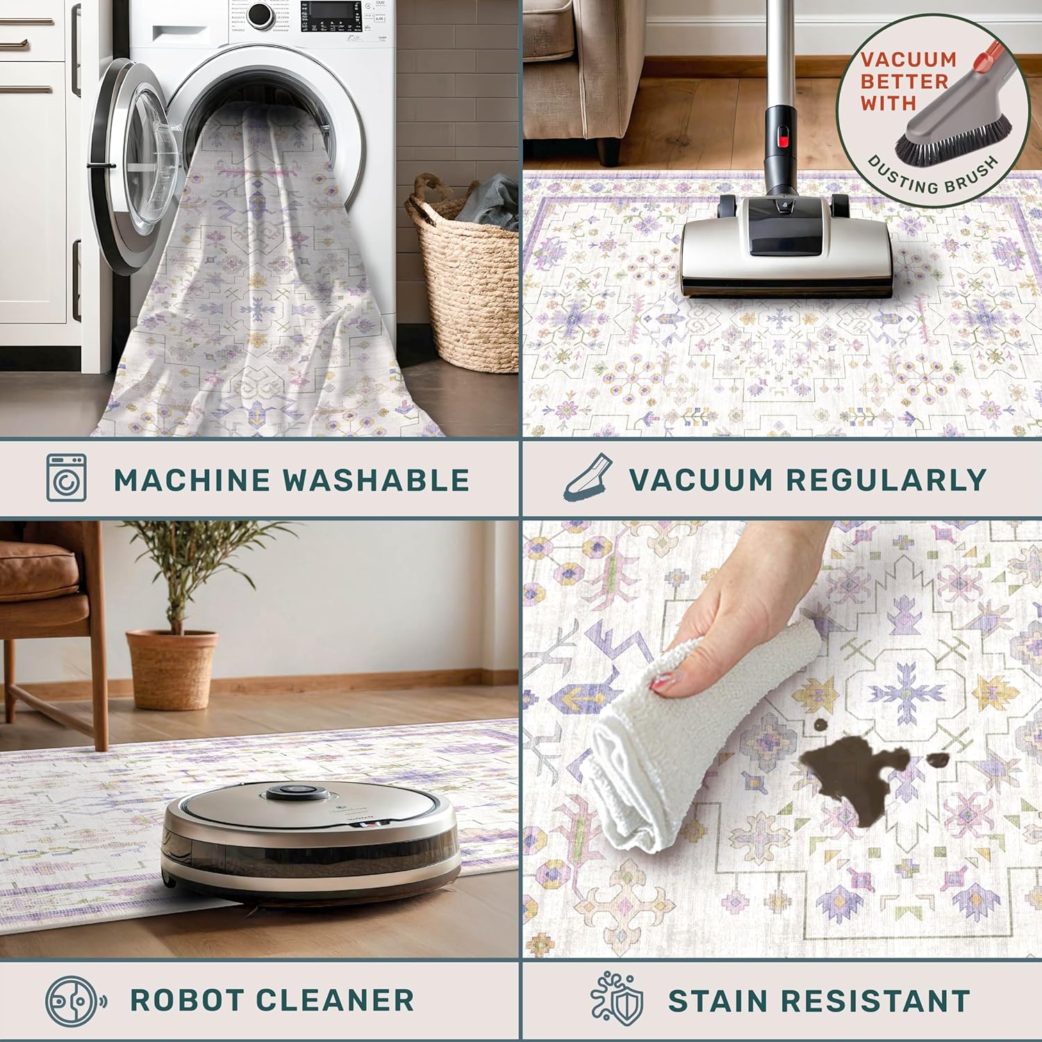 - Machine Washable: Keep your rug fresh with ease! Simply vacuum regularly, or for a deeper clean, toss it in the machine. Ideal as a baby rugs for nursery, boho rugs for living room and light purple rugs for bedroom girls. Durable for everyday use.