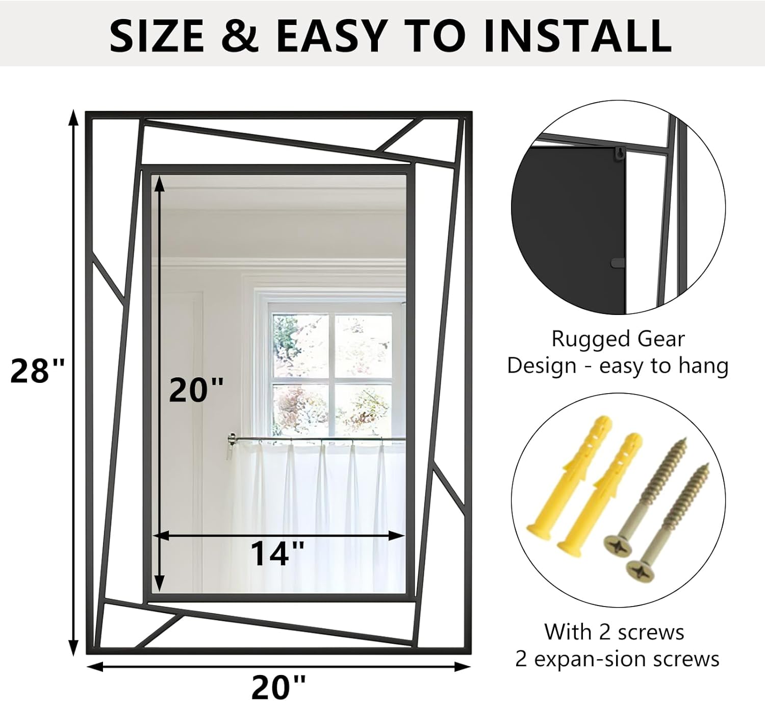 Black Bathroom Mirror for Wall 28''X20'' Matte Black Rectangle Wall Mirror with Geometric Metal Frame, Anti-Rust, Hang Horizontally or Vertically