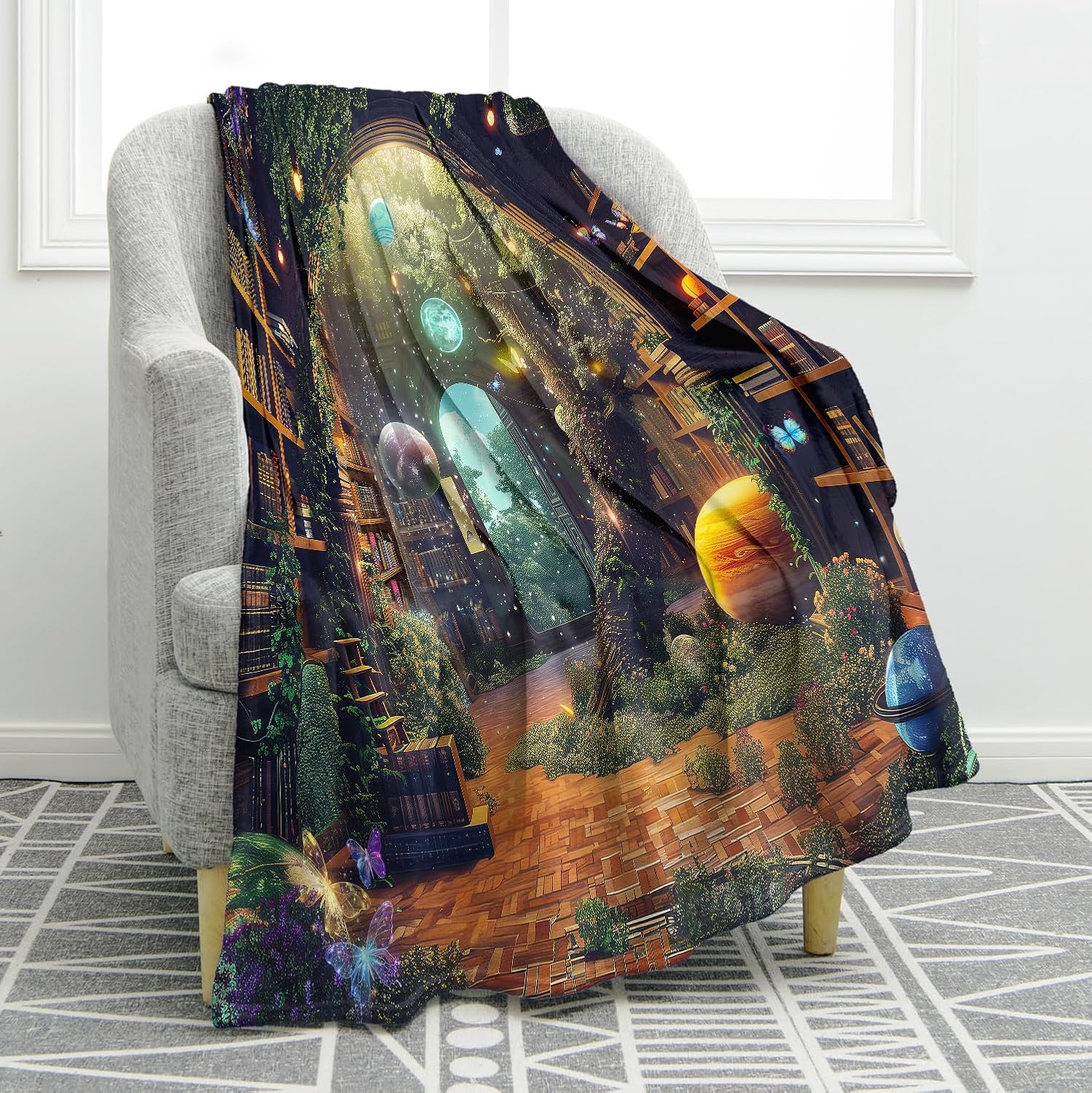 Jekeno Starry Sky Planet Bookshelf Blanket Gifts for Women Men Kids Halloween Birthday Christmas Library Book Bookcase Mysterious Tree Flowers Decor Bedroom Study Classroom Living Room Throw 60"x80"