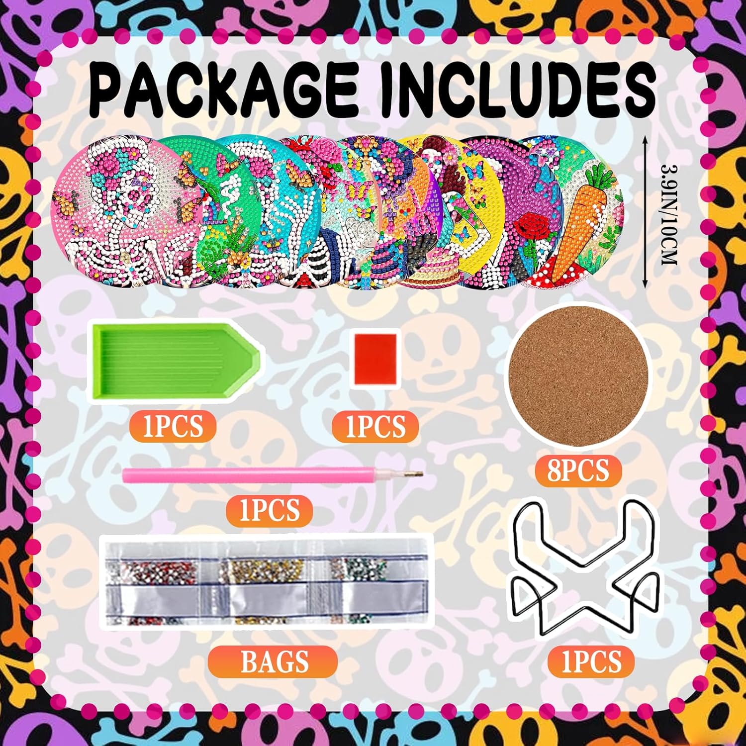 DOZEEZOP 8 PCS Skull Diamond Art Coasters Kit, Abstract 5D Diamond Painting Coasters with Holder, Fall Small Diamond Art Kits for Adults Beginners, Diamond Dots Arts and Crafts Supplies